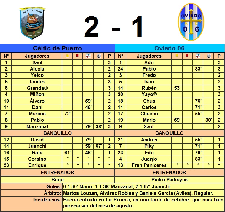 4.- COL. RIAÑO: Rober; Diego; Jaime; Pedro (Pablo.64); Bertin; Calucho (Edu.55); Cristian; Yonatan; Luis (Adri.85); Jose (Julio.75); Eduar. 1.- LLARANES C.F.: Fran; Fran Rey; Viti; Juanky (Sergio.64); Alonso; Castaño; Pablo (Jairo.64); Andrés; Yoni; Guti (Luciano.75); Peláez. Árbitro: Jorge López García (Delegación de Occidente). Tarjetas por el Riaño a Cristian, Jose, Edu y Pablo y por el Llaranes a Viti. Goles: 0-1 min. 41 Guti. 1-1 Jose min. 73. 2-1 min. 84 Luis. 3-1 min. 90 Pablo. 4-1 min. 93 Edu. Partido disputado en la mañana del domingo en el Colegio Riaño, campo de reducidas dimensiones donde el Llaranes durante 70 minutos hizo un buen partido y mereció llevar algún gol mas a su favor, en la 1ª parte desperdiciaron varias ocasiones de Guti, Pablo y Castaño que no se materializaron y hubo que esperar al minuto 41 para que de un corner botado por Castaño lo rematara Guti de cabeza a la red. De ahi al descanso poco más. sin que el Riaño hubiese llegado claramente a la portería defendida por Fran. En la 2ª parte seguiría con ocasiones el Llaranes, balón al larguero de Fran Rey, pero en el minuto 73 , nuevamente y van varias esta temporada, fallo en defensa del Llaranes y empate del Riaño por mediación de Jose, en el 84 otro fallo y Luis adelantaría al Riaño, el Llaranes intentó salir a empatar en los minutos finales pero primero Pablo y en el descuento Edu al trasformar muy bien una falta dejaría el marcador en 4-1.