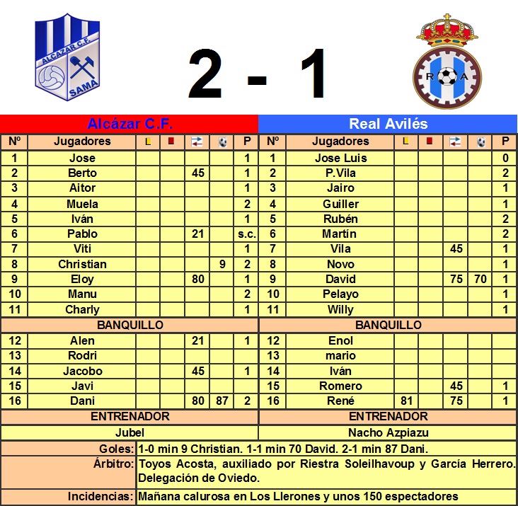 El Alcazar logra su primera victoria de la temporada ante un Avilés que venía en buena racha y que se presentaba como favorito para llevarse el choque de Los Llerones. Los langreanos comenzaron mandando y a los ocho minutos un saque raso a la frontal del área en un saque de esquina, llega a las botas de Christian que golea a puerta para anotar el primer tanto de la mañana. A partir de ese momento, el partido se volvió muy disputado y cada balón dividido era una batalla para hacerse con él. Tan solo algún destello cuando la pelota le caia en las botas a Manu y Christian, por parte de los locales y a Pelayo por los visitantes. En la segunda mitad el Avilés empató tras un fallo del portero al no atrapar un golpeo de falta y empujar David el rechace a la red. El Avilés trató de ir a por el partido y, prácticamente en los últimos minutos, un balón largo que sale a despejar el guardameta avilesino hace que la presencia de Dani provoque su fallo y el pequeño delantero se aproveche y consiga el que a la postre sería el gol de la victoria.