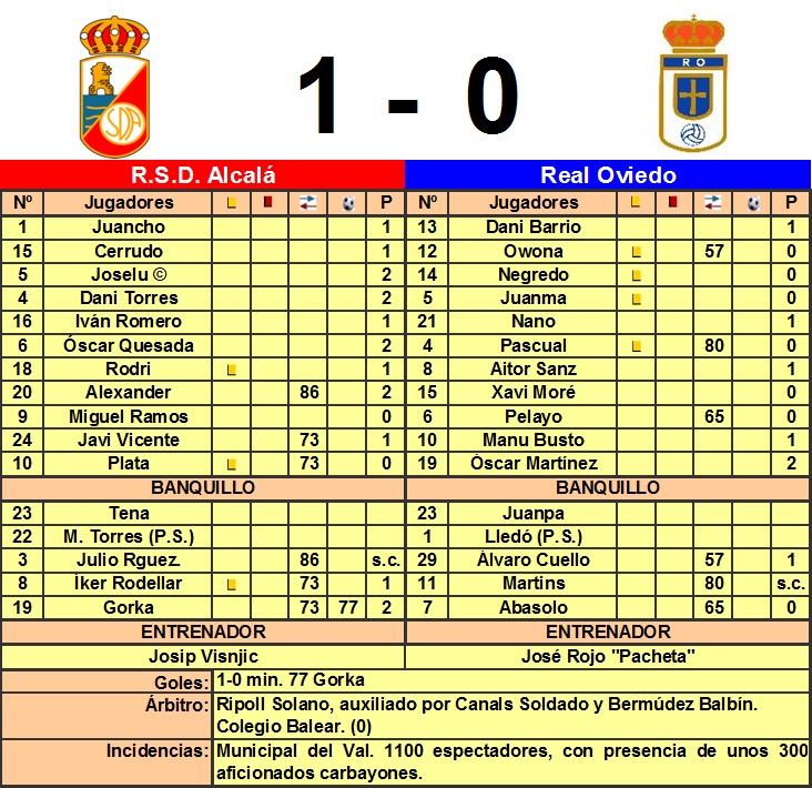 Nueva derrota del Real Oviedo esta temporada, que le aleja aún más todavía de los puestos de play off, aunque con partidos como el de este domingo, difícilmente alcanzará los puestos de gloria. Enfrente, el Alcalá, otro equipo muy necesitado de puntos, que llegaba al encuentro sin conocer la victoria, y que tras su triunfo, se sitúa a tan solo un punto de los de Pacheta. El partido en tierras alcalaínas, fue un verdadero desastre por parte de los asturianos, que ni espoleados por su gran afición, lograron apenas inquietar al guardameta local, salvo en dos acciones, una en cada tiempo. La primera fue en el minuto treinta y cinco, cuando Óscar Martínez se plantó solo ante Juancho, que le sacó el balón en una acción de reflejos, más propia de otro deporte. La segunda, fue la última acción del partido, en una falta directa que botó Manu Busto sobre la frontal del área, que se estrelló en el larguero, ya con el tiempo cumplido. Entre tanto, juego plano, previsible y primitivo de un equipo sin ideas, ante un Alcalá, bien plantado sobre el terreno de juego, que si bien no fue superior, si jugó algo mejor, y tuvo más oportunidades para llevarse el encuentro, la mayoría en tiros desde fuera del área, que o bien se marcharon fuera, o bien atrapó sin dificultad el meta Dani Barrio. Pero fue en el único disparo desde dentro del área, en el que se adelantaron los rojillos, y con ello, certificaron el triunfo, en un grave error de Negredo, que se confió, y al que el recién ingresado Gorka (apenas llevaba tres minutos sobre el campo) le ganó la cartera, y batió a Dani Barrio, con un toque sutil con su bota derecha, desde el área pequeña. Eso ocurrió en el minuto 77, y desde entonces hasta el final, los de Pacheta intentaron remediarlo, y lograr lo que no habían hecho en trece minutos más el descuento, sin apenas acierto, con lo que se llevaron una nueva derrota, que les sitúa al borde del descenso. El técnico azul pasó