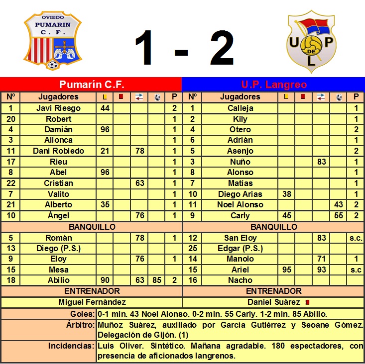 La jugada clave llegó en el minuto 85, una falta en la frontal del área langreana, muy protestada por Daniel Suárez, que estuvo un buen rato discutiendo la decisión de Muñoz Suárez, la transforma el exjugador azulgrana, Abilio, batiendo a Calleja por su poste, posiblemente la barrera o algún jugador le impidieron ver la trayectoria del balón. Con el 1-2, el Pumarín estiró líneas aprovechando el nerviosismo del Langreo y pudo empatar en el 96, plantándose Valito sólo ante Calleja, que ante su salida elevó el balón, saliendo desviada su vaselina. Al final, los puntos para un Langreo que no hizo mucho y el Pumarín, que haciendo poco se quedó con la miel en los labios.