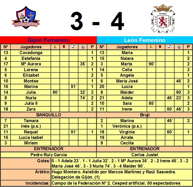 plantaron cara. ![]() Mañana soleada en los campos de de la Federación ambos equipos disponían una distribución táctica muy similar con 4-2-3-1, aunque se notó al León mucho mejor asentado en el campo que su rival, y por fases del encuentro una mayor intención de jugar el balón. Empezó el partido con mucho respeto entre ambos equipos tanteándose mutuamente, con cierto miedo a desproteger su portería. En la primera ocasión de peligro de peligro llegó el gol para el equipo visitante la internada por la izquierda de Irene, jugadora con mucho peligro gracias a su velocidad y regate, llegó la jugadora leonesa a la línea de fondo balón atrás para María José que de espaldas a la portería juega de cara para Sara que le pega desde la frontal, el balón es rechazado por Marina llegando el balón para Adela que le golpea de primeras, gol por toda la escuadra que hizo inútil la estirada de Covadonga. Continuó el partido con muchas imprecisiones en los pases, el Gijón no lograba conectar con una delantera muy solitaria que se veía superada continuamente por la defensa leonesa sobre todo por el gran partido de Celia. En el 32´ golpea el Gijón con un contragolpe, avanzaba por la derecha Nuria que cambio el balón de banda hacia la izquierda donde la internada de Julia II logró llegar justo antes que la portera rival dejándole el gol en bandeja para que Julia marque ante la presión de Celia. En el 35´el Gijón lograba adelantarse en el marcador con un gol olímpico de Mª Aurora. Avanzó la primera parte con un juego trabado con continuos robos en el medio campo. Cuando parecía que se acababa la primera parte llegó el empate del León. María José avanza por la banda derecha centrando al área, el balón se le escurre a Covadonga cuyo regalo aprovecha Irene para marcar. Se hacía justicia al descanso con el empate viendo los méritos de ambos equipos, el León con más juego gracias sobre todo al muy buen partido que realizaron muchas de sus jugadoras como Irene, Celia, Maider o Adela. Mientras que el Gijón le ponía muchas ganas y esfuerzo. La segunda parte empezó muy bien para el equipo visitante, en el 46´Maider saca una falta desde la esquina derecha del área, el balón no lo toca ninguna jugadora pero a Covadonga se le escurre y María José empuja el balón a las mallas ante la presión de la defensa. Achuchaba el León que se hizo con el control del partido y pudo hacer sangre en el 55´Marina entra por la banda derecha realiza un buen regate hacia dentro y le pone el balón para Maider que en la frontal se da la vuelta y saca un buen disparo que es repelido por el larguero. En el 65´Sara jugó un buen balón para Virginia pero Covadonga hizo una buena salida despejando a banda, en este saque de banda el balón llegó a Sara que disparó desde la frontal rozando el larguero. El Gijón intentaba deshacerse del dominio visitante pero no lograba inquietar la portería rival. En el 74´una jugada de fortuna propiciaría el empate Nuria lanza la falta desde la izquierda el balón golpea en la barrera y se cuela por la escuadra derecha de la portera que no pudo hacer nada a pesar de su estirada. Entró el partido entonces en un constante disputa con muchos nervios por ambos equipos. Cuando parecía que se iba a terminar el partido con el empate Marina entra por la banda izquierda aprovechando su velocidad para superar a su marcadora le pone un buen balón por bajo hacia Maider que desde el punto de penalti supera a Covadonga. Gol que hacía justicia al fútbol mostrado por el León que en todo momento quiso llevarse el partido.