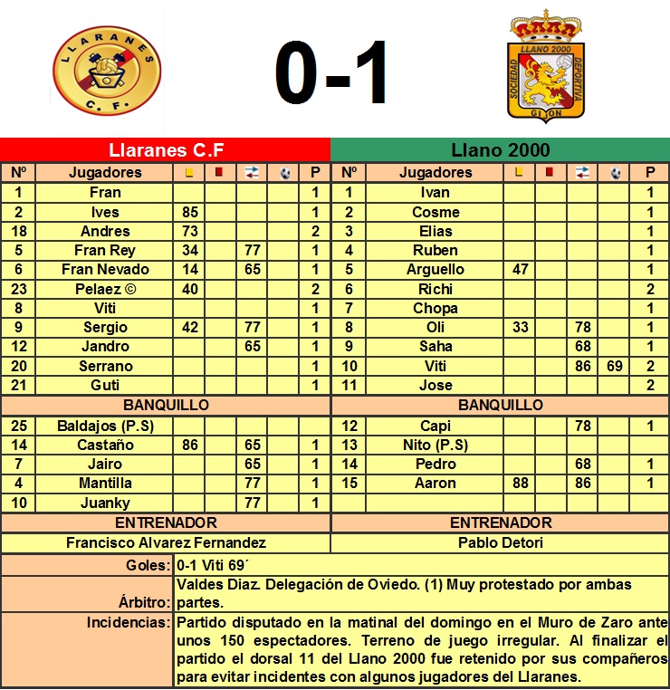 Ya en el segundo minuto de juego, Chopa entraba en velocidad entre los defensas avilesinos, pero tras regatear a Fran en su salida, se quedaba demasiado escorado para anotar el primer tanto de la mañana, y antes de llegar a los primeros 10 minutos de juego el Llano 200 disponía de una nueva ocasión para inaugurar el marcador, cuando una falta lateral botada por Viti se paseaba por el área pequeña sin que ninguno de los jugadores visitantes acertase a empujar el esférico a la red. No seria hasta los 15 minutos de partido cuando el Llaranes se acerco con peligro al área de Iván. Guti dispuso de dos ocasiones casi consecutivas, pero en la primera ocasión Iván resolvió con acierto y en la segunda el balón se fue junto al poste derecho de la portería. La primera jugada polémica del partido llegaba en el minuto 27, cuando Viti entraba en velocidad por el centro y cuando encaraba a Fran, cedía el balón para Jose quien marcaba a puerta vacía. El gol fue anulado al encontrarse Jose adelantado respecto al balón. El partido entró en unos minutos de juego tosco y de balones en largo, donde Peláez por parte local y Jose por parte visitante eran los protagonistas del partido. En el minuto 40 un saque en largo de Iván era peinado por Jose para que Chopa, entrando en velocidad, regatease a Fran y cuando todo parecía indicar que los visitantes se adelantarían en el marcador, el balón golpeaba en el poste. El descanso pareció sentar bien a los locales, que salieron presionando mucho la salida de balón del Llano 2000, pero las ocasiones no llevaban demasiado peligro. La unica ocasión reseñable fue un potente disparo de falta de Pelaez que Iván atrapó en dos tiempos. En el minuto 69 llegaría el gol decisivo, cuando Viti recibía un balón en largo en banda izquierda y con un control orientado se libraba de la marca de Andrés, para batir por bajo a Fran. De ahí al final del partido, el arbitro fue el protagonista del partido ya que sus decisiones fueron muy criticadas por ambos equipos, no dejando contento a nadie. Guti gozo de una buena ocasión en el 83, pero cuando tenía todo a favor para marcar, el control de balón se le fue largo e Ivan lo recogió mansamente. Los visitantes pudieron dejar resuelto el partido en el minuto 87 cuando un fuerte lanzamiento de falta de Pedro golpeaba el larguero, el balón llegaba a Chopa, quien remataba a puerta de cabeza, pero Fran, desde el suelo, enviaba el balón a corner. Cuando el partido tocaba a su fin, Andres sufrió una lesión que obligó a sacarlo en camilla del terreno de juego dejando a su equipo con 10 al haber agotado los cambios. Al final del partido se produjeron algunos incidentes entre los jugadores del Llaranes y Jose, pero no llegó a mayores.