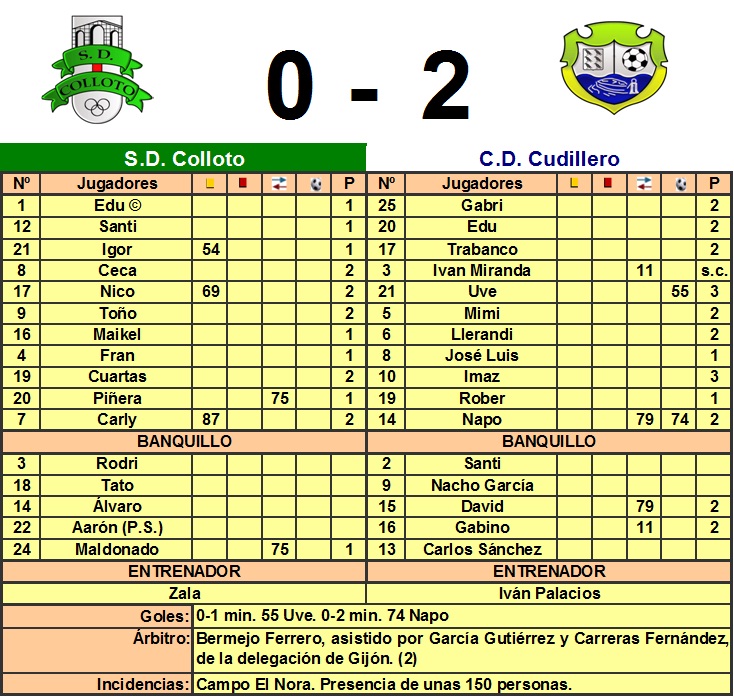 El gol llegaría, pero sería el de la confirmación de la victoria para el Cudillero. Un gran pase por la banda de Uve habilitaría a Imaz, que con tiempo para centrar puso el balón al área pequeña y un mal despeje de la zaga del Colloto dejaría el balón a los pies de Napo para que marcara el segundo. De ahí hasta el final, el Cudillero se dedicó a guardar la posesión del balón sin arriesgar. Con el final del encuentro el Cudillero logra 3 puntos importantísimos para establecerse en la zona media de la tabla, mientras el Colloto rompe su racha positiva en casa y continua en los puestos de peligro.