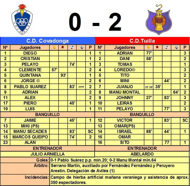 Antes lo intentó el Cova por mediación de Piero en minuto 8 con un buen disparo atajado por el notable portero Adrían. Tuvo su contestación, por parte de los “dinamiteros”, en el minuto 13 a los pies de Yoni cuyo remate se marchó fuera por muy poco. Tras el gol, los locales se estiraron un poco pero la buena organización del Tuilla en defensa hizo que la llegada a meta con gol se viese anulada por fuera de juego en el minuto 25. El momento que pudo ser decisivo para el encuentro lo protagonizó el muy activo Juanjo que ya había visto su primera amarilla por agarrón a un contrario y no terminó la primera parte cuando en el minuto 35 intenta llevarse el balón con la mano y la grada se encargó de clamar la segunda amonestación. Ni con esas, un Covadonga mermado por las lesiones, pudo remontar ante una buena defensa y un portero que dominó por lo alto, atajó en varias ocasiones en el uno contra uno y hasta administró bien sus tiempos incluido el de cambio de botas. Con la impotencia local, los de Tuilla haciendo lo justo y al contraataque sacaron de quicio a la defensa del Cova y así provocando una falta discutida en la frontal de área que muy bien ejecutada por Manu sentenció el partido con el 0-2 final. Serios los chicos del “pitu” Abelardo donde se deja ver la mano del que fuera gran defensa y esperar mejor fortuna para los del Rabanal ya que calidad no les falta.