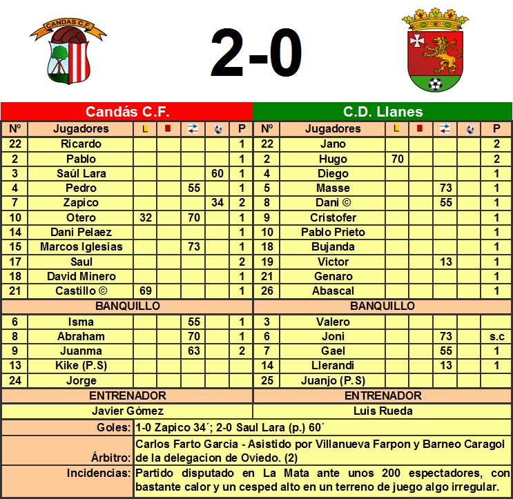 El partido discurrió sin mas incidencias que la lesión de Víctor en los visitantes, hasta el minuto 26 cuando Pablo Prieto picaba un balón por encima de los centrales del Candas para la entrada de Dani, que con todo a favor, lanzaba el balón cerca del poste izquierdo de la meta de Ricardo. El susto de la ocasión visitante pareció despertar del letargo a los locales, que 5 minutos obligaban a Jano a salir de su área para cortar con el pie una rápida carrera de Otero, fue la antesala del primer gol local. En el minuto 34 Zapico controla, de espaldas a portería, un balón centrado desde la derecha, y a la media vuelta colocaba el balón en la escuadra derecha de Jano, que a pesar de tocar el balón no pudo evitar el tanto local. Un gol de bella factura. Los últimos minutos del primer tiempo fueron para el Candas que pudo irse con una mayor ventaja en el marcador si Saúl hubiera llegado a rematar un buen centro de Otero desde la banda izquierda en el minuto 39.