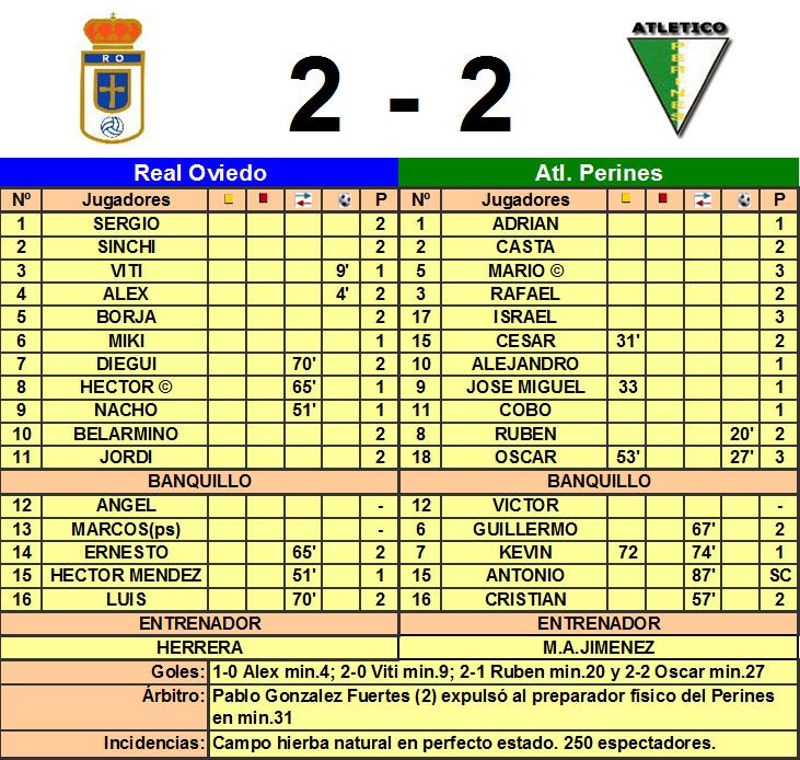 Desafortunados los delanteros locales que ven como sus compañeros defensas meten los goles aunque, acudiendo al tópico, todos esperamos que se rompa el maleficio y el ansia pueda menos que la calidad. Por hablar de las ocasiones perdidas, el primer aviso lo dio Héctor en el minuto 2 mandando un balón al larguero, Nacho se queda solo ante el portero en el minuto 6, Nacho de nuevo en el minuto 18 remata muy de cabeza aunque sin puntería, en el 34 Héctor se vuelve a quedar solo con el portero. Con todo ello, los cántabros se colaron entre los defensas en jugadas individuales para igualar el partido y a punto estuvieron de marcar en el minuto 44 sino hubiese estado tan acertado Sergio que salvó el 2-3. Tras el descanso, el Oviedo tuvo más la posesión del balón pero se volvió a mostrar menos peligroso en la finalización y el Perines intentó sorprender jugando a la contra provocando alguna inseguridad a la defensa.