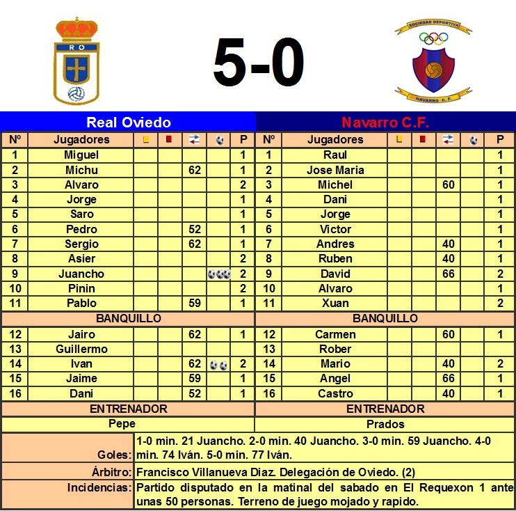No seria hasta el minuto 69 de partido, cuando una jugada de triangulaciones entre los jugadores de medio campo del Oviedo permitía que Pinin entrase en velocidad por la derecha y que su centro fuese aprovechado por Juancho, quien desde la frontal ponía el 3-0. El cuarto gol de la mañana llegaría a 6 minutos del final cuando un pase en profundidad de Asier era aprovechado por Iván, para entrar en velocidad y batir con pierna derecha la meta de Raúl. El gol que completaría la popular “manita” llegaba a 3 minutos del final cuando una buena carrera por banda derecha de Jairo, era culminada con un centro que se quedaba enganchado en las piernas de Jorge, dejando el balón franco para el remate de Iván a apenas 2 metros de la línea de gol. 5-0 en el marcador y final del partido.