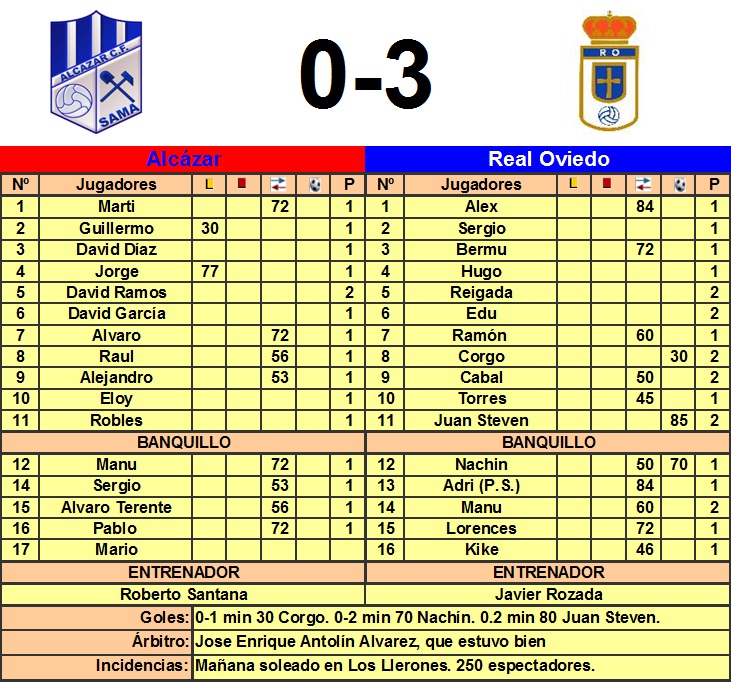 El Real Oviedo se presentaba en la mañana del domingo en Los Llerones, después de haber perdido la primera plaza por la diferencia de goles, pero con la firme intención de seguir sumando . El Alcazar por su parte, llegaba después de conseguir su primera victoria, que además fue a domicilio en Avilés. El encuentro comenzó con alternativas y con una clara ocasión para los locales, aunque según fueron pasando los minutos se fueron haciendo los ovetenses con el control del partido, tratando de entrar sobre todo por banda izquierda, aunque Juan, no estaba hoy del todo acertado, aunque si batallador como siempre. EL primer gol llegó en una jugada afortunada para el Oviedo., ya que un balón parado sacado desde el centro del campo por Corgo, con la firme intención de buscar un rematador, sorprendió a todos y acabó alojándose cerca de la escuadra langreana. El Oviedo seguía intentando llegar y asi en una jugada a balón parado bien trenzada, Cabal estrelló el balón en la madera. La segunda parte siguió con la misma tónica y el Oviedo conseguiría sentenciar el encuentro en dos acciones de Nachín y Juan. El Alcazar apenas inquietó. |