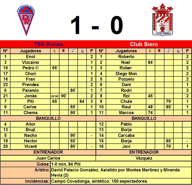 El partido empezó con ambos equipos bregando por hacerse con el control del balón con un juego enfangado en el medio campo sin poner en peligro las porterías. El Roces se veía asfixiado en el medio campo y chocaban con una defensa muy segura, sobre todo en los balones largos de los que abuso en exceso el Roces. En el 21´hay una falta frontal que pone en juego Pedro hacia donde se encuentra Chori, solo pero no logra controlar el balón paseándose el balón por delante de la portería. En el 25´Una buena internada de Rodri por la banda derecha superando a Pedro con un bonito regate entrando en diagonal al área pero su disparo se fue rozando el larguero. En el 28 volvería a avisar el Siero cambio de banda de Rober hacia la banda derecha donde Rodri gracias a su velocidad supera a la defensa, centrando al segundo palo donde Marcos remata de volea, que obliga a una buena intervención de Enol. En el 39´el Roces tuvo su oportunidad con un muy buen pase de Paramio a la espalda de la defensa dejando solo a Chema que supera en carrera la salida del portero pero no puede evitar que el balón se vaya por línea de fondo. En esta primera parte destacaron además de ambas defensas los intentos de Jonás y Piti por parte del Roces, el primero buscando jugar la pelota y Piti intentando abrir una vía por la banda izquierda. Y en el Siero destacó sobre todo Rodri, que fue un quebradero constante para el Roces, gracias a su velocidad. Durante la segunda parte seguía el Siero dando una mayor sensación de peligro. Pero se produjeron dos hechos importantes a favor del Roces. El equipo dio unos pasos hacia adelante presionando la salida del balón al Siero, lo que fue propiciando más robos de balón y complicándole la vida al equipo visitante. En el 50´el Siero dispuso de una ocasión a balón parado, Dani botó la falta desde la derecha cambiando el balón de banda, donde recibe Marcos que centra de primeras pero el balón no logran rematarlo ni Raul ni Chule, el remate final de Roi acabó en las manos de Enol. El Roces aumentaba su ansiedad y atacaba con más corazón que cabeza, aumentando su ansiedad con el paso de los minutos. En el 73´de nuevo el Siero pudo adelantarse en el marcador con un balón largo de Diego Mon hacia Rodri llegando has la línea de fondo jugando hacia atrás para Roi quien centró de primeras para el remate de cabeza de Chule que se fue alta por muy poco. En el 84´ llegaría el gol del Roces, en una falta desde la izquierda que lanza Piti con la derecha, el portero preocupado por el centro no puede impedir que se cuele directamente por el segundo palo. Bonito gol local, con el cual se acabo el partido, ya que los restantes minutos murieron en las disputas en el medio campo.