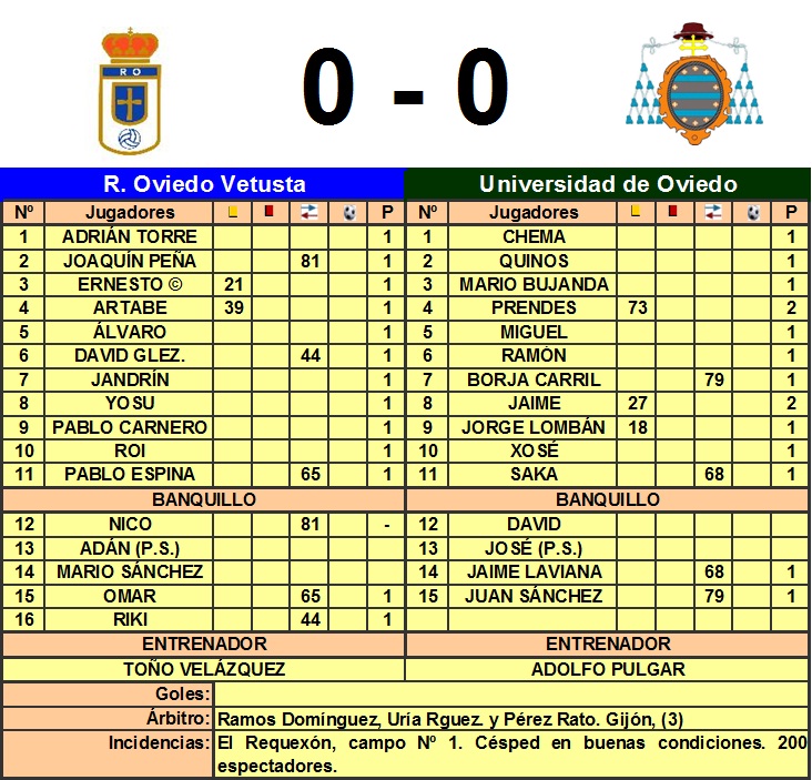 Primer partido de la jornada 35 de Tercera División, adelantado a la matinal del Jueves Santo. Tanto el Vetusta como el Universidad llegaban plagados de bajas, Velázquez completó la convocatoria con tres jugadores del juvenil, Adán, Mario Sánchez y Omar; Pulgar convocó a varios jugadores del "B" que tienen habitual participación con el "A" como Saka, Bujanda, José, David y Jaime Laviana.