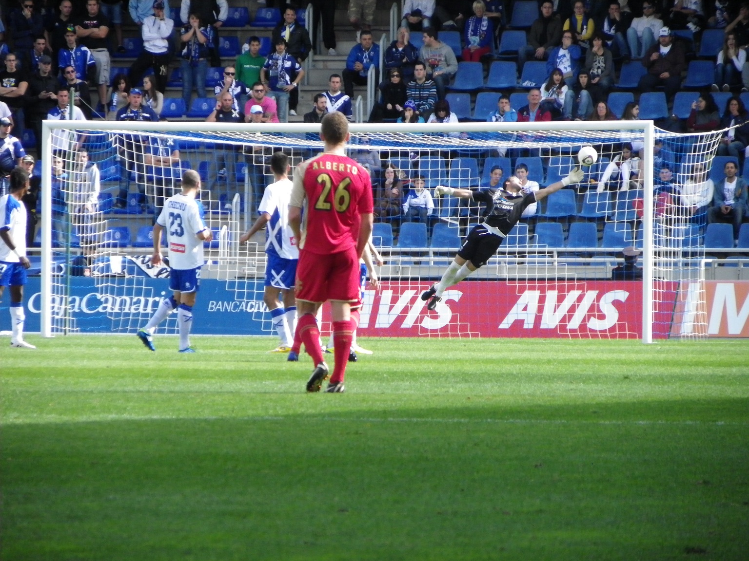 Llegó un nuevo mazazo. Una dudosa falta de Kitoko. Juan Muñiz agarró el balón y lo lanzó junto a la escuadra de un superado Aragoneses (34’). 0-2. Mal pintaban las cosas. Y mira que la mañana había comenzado con otro aire. A los 38 minutos se escucharon los primeros gritos contra el entrenador local: Calderón, dimisión. Otros domingos, con mucho menos fútbol (y ocasiones), el Tenerife mandaba en el marcador. Llegó el tiempo de descanso y la desventaja era muy grande ¿Insalvable? Quizá no, pero mucho y bien había que remar para llegar a la orilla.