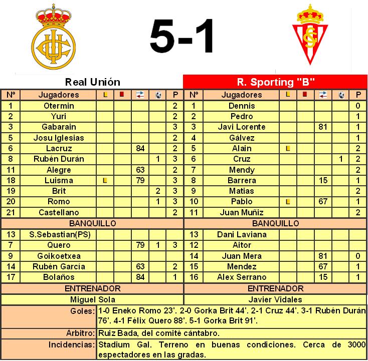 El Real Unión sigue con su racha de trece de los últimos quince puntos y hunde más a los de Javier Vidales. El partido empezó con mucha disputa de balón por parte del equipo irundarra, a los ocho minutos Romo dispuso de una ocasión para adelantar al Unión. Al cuarto de hora del inicio del partido Barrera tuvo que ser sustituido por lesión. Ocho minutos después llegó el primer tanto de la tarde, Eneko Romo remataba de chilena un pase de Durán. Un minuto antes del descanso llegaron los dos siguientes goles. Gorka Brit ponía el 2-0 tras una buena jugada de Luisma por la banda y unos segundos antes del final de la primera parte Cruz conseguía meter al Sporting en el partido, en un gol en el que Otermin no supo blocar el balón. En la segunda parte el equipo visitante salió enchufado, pero el balón les duraba poco y el Real Unión tuvo dos ocasiones, una de Alegre y otra de Durán. En el 26 de la segunda parte Alex Serrano disparo desde fuera del área, pero Otermin pudo atrapar fácilmente el esférico. En el minuto 76 Rubén Durán materializó el tercer tanto de los irundarras. Siete minutos después, el recién incorporado Quero sentenció el partido transformando en gol un pase del delantero Brit, que dejó al delantero solo ante el guardameta. El Real Unión no quiso desaprovechar la ocasión de lograr una goleada en el último partido del equipo en su estadio y ya en el añadido Gorka Brit transformo el quinto gol. En el último minuto de los tres que añadió Ruiz Bada, el Sporting conseguía su segundo tanto del partido, aunque este fue anulado por fuera de juego. En la rueda de prensa tras el partido los dos técnicos estuvieron de acuerdo en que <<La derrota ha sido abultada>>. Fotos: |
