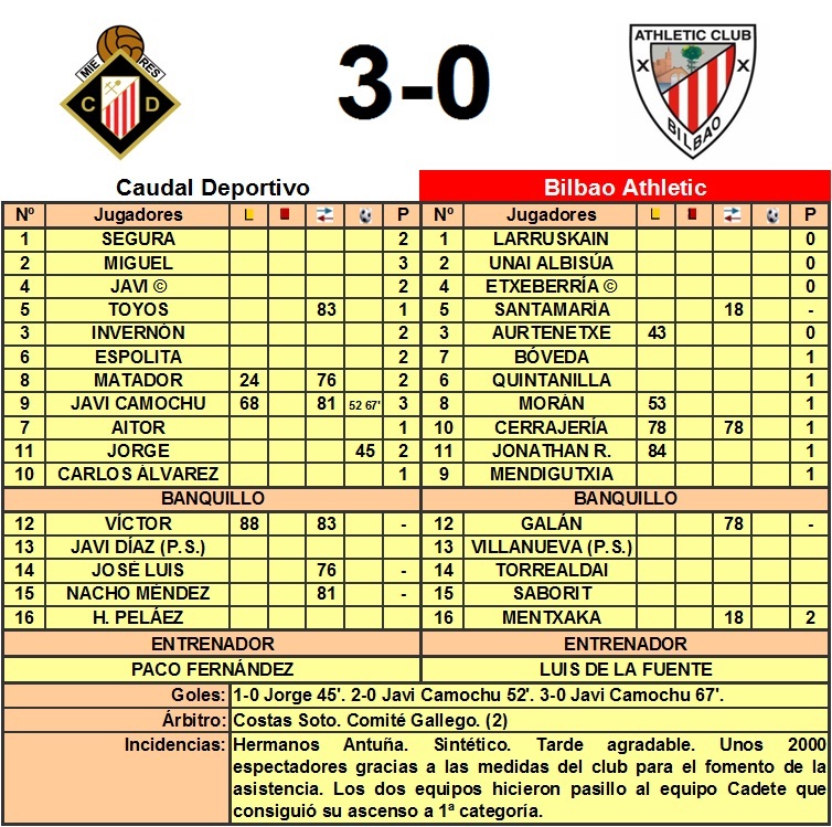 El Caudal goleó a un triste Bilbao Athletic que ofreció muy poco en su visita al Hnos. Antuña. Jorge y Javi Camochu (2) fueron los autores de los goles. El desenlace se jugará el domingo en La Muela. El Caudal solventó con éxito su penúltima final ante el filial bilbaíno que vuelve a salir goleado de tierras asturianas igual que tras su visita al Tartiere. Los del mítico ex-futbolista del Athletic, Luis de la Fuente, están salvados y haciendo probaturas hasta final de temporada, además de no poder contar con su jugador estrella, Urko Vera, que disfrutó ayer en San Mamés de algunos minutos. Los bilbaínos llevaban seis empates consecutivos y los de Paco consiguieron romper esa racha, para bien de los mierenses. Paco Fernández tenía las bajas de los lesionados Salva, Pevida y Nacho López, además del sancionado Alberto Saavedra. No se acusaron las bajas y Javi despachó un buen partido en sustitución de Saavedra. Salieron con tranquilidad los locales, pero con agresividad en todo momento y el primer tiempo transcurrió con dominio alterno en la posesión de balón, aunque todas las ocasiones fueron para los locales. El filial bilbaíno no tiró a puerta entre los tres palos, aunque reclamó un posible penalti cerca del perímetro del área de Javi, que con el colegiado muy cerca no señaló nada. Casi llegando al tiempo de descanso, Jorge se desmarcaba entre la blanda defensa bilbaína y Matador le asistía perfectamente para que el extremo avilesino se plantase ante Larruskain y consiguiera el 1-0. Tras el descanso las cosas no cambiaron y las ocasiones siguieron llegando para el Caudal, en el 52' una internada hasta la línea de fondo de Armando Invernón, que finalizó con un pase al punto de penalti, sirvió para que Javi Camochu empujase a la red el 2-0. Los laterales caudalistas, Miguel e Invernón despacharon un gran encuentro y estuvieron muy participativos, sobre todo el primero, en ataque. En el 67' Camochu aprovechaba la indecisión de la zaga visitante para robarle la cartera y fusilar ante Larruskain consiguiendo el 3-0 definitivo. A partir de ahí los leones sacaron el orgullo y dispusieron de dos ocasiones similares, dos centros desde la derecha de Mentxaka que remataba desviado Mendigutxia el primero y en el segundo cuando todos pensábamos que acabaría en gol, Segura nos sorprendió enviando a córner demostrando sus reflejos. A pesar de la victoria el Caudal sigue en puestos de play off de descenso por el resultado del Guijuelo, pero los de Paco Fernández evitan así la posibilidad de caer en descenso directo salvo debacle en La Muela. |
