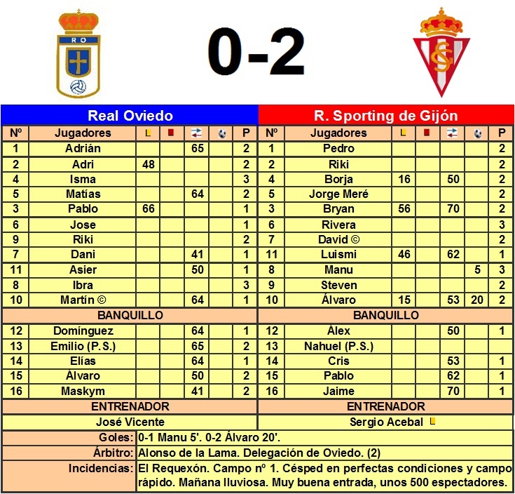 Los dos equipos salieron con un esquema similar con tres jugadores en el centro del campo, pero fue el Oviedo quien llevó un poco más la iniciativa, ejerciendo su papel de local, ante un Sporting que salía muy rápido a la contra. Muy pronto se adelantaron los visitantes con un centro chut de Manu desde la izquierda que bate por arriba a Adrián como se ve en la 3ª foto. Pudo ampliar distancias pronto el equipo de Sergio Acebal tras una buena combinación entre Steven y David que finalizó este último y que atrapó Adrián en dos tiempos. También pudo empatar el Oviedo, por mediación de su hombre más participativo en ataque, el delantero Ibra dejaba atrás a dos defensas dentro del área y enviaba su disparo al poste izquierdo de la meta de Pedro. El partido estaba muy igualado y el campo muy rápido y los equipos perdían pronto la posesión de balón. En el 20' llegó el 0-2, una buena internada de Steven que asiste a Álvaro para que bata a placer a Adrián. En el 35' pudo sentenciar David pero el guardameta oviedista evitó el tercero. Sólo un cambio en el descanso, por parte de José Vicente, que dio entrada a Maskym, participativo durante la segunda mitad. El partido fue perdiendo fuelle, el Sporting lo llevó a su terreno para que corriera el tiempo y consiguió que apenas hubiese aproximaciones a los áreas, el Oviedo retrasó la línea defensiva para evitar las llegadas por banda de sus rápidos extremos y apenas inquietó la portería de Pedro para recortar distancias. La ocasión más clara fue en el 74' un saque de puerta en corto de Emilio que roba Steven y se encuentra con una gran parada del portero oviedista que envió a córner. Justa victoria del Sporting que consigue así el campeonato de Asturias Infantil, superando en 4 puntos al Real Oviedo que finaliza 2º. Fotos: