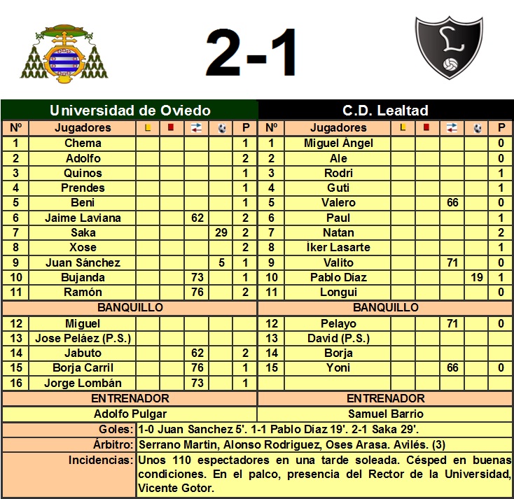 El Universidad tenía que ganar para no depender de los resultados del Langreo y Tuilla para conseguir la segunda plaza que le evite enfrentarse a un primero en la segunda ronda. El Lealtad por su parte consiguió la permanencia la semana pasada y afrontó el partido de forma relajada. Partido sin historia, aburrido en ciertas fases y con dos equipos con miras muy distintas, el Uni salió a conservar su segunda plaza y el Lealtad esperando las contras y replegado en su campo. Esa conformidad dio alas a los dos interiores del Uni, Ramón por banda izquierda y Saka por la derecha, que trajeron en jaque a los dos laterales del Lealtad. El primer gol vino de una jugada por banda izquierda de Ramón cuyo centro es rematado de cabeza por Saka y un listo Juan Sánchez remataba de cabeza entrando la pelota casi sin fuerza en la portería de Miguel Ángel. El empate vino precedido de un fallo de una muy relajada defensa universitaria, siendo Pablo Díaz quien subió el tanto al marcador ante un atónito Chema que estaba peleando por ser el Zamora de la categoría y que con este gol posiblemente se le malogre. El gol de la victoria estudiantil vino precedido de una gran jugada por banda izquierda de Ramón cuyo centro fue rematado por un bullicioso Saka al larguero y rebasando el balón la línea de gol en el bote posterior. Tuvieron los maliayos dos ocasiones más de gol pero la poca fortuna en los disparos no lograron el objetivo. El Uni pudo aumentar su casillero en otras 3 ocasiones, la más clara una de Jorge Lombán. Resumiendo partido aburrido y que certifica la segunda plaza del Universidad de cara al play-off. El sorteo se celebra mañana en Madrid a las 5 de la tarde y el Uni tendrá enfrente a un 4º clasificado. Fotos: |