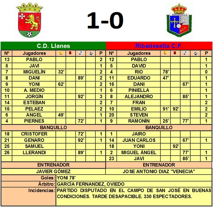La segunda parte fue una constante de interrupciones, saques de banda, baja intensidad y ambos conjuntos más ocupados de alejar el balón de su área que de irse a por la victoria. Se mascaba cierta tensión en las aproximaciones en uno u otro área pero que se quedaban en eso, en aproximaciones y miedo. Yoni para los llaniscos gozó de las mejores ocasiones y Steven y Emilio para los riosellanos. Cuando el partido transcurría directo al puerto del empate a nada llegó una falta botada por Dani Pelaez en zona del centro del campo que Yoni, ayudado por el central riosellano Río, arañó hacia la red. El Llanes se ponía por delante casi más por demérito del rival que por mérito propio. A partir de ahí los llaniscos gestionaron esa renta paralizando, aún más, el partido ante un Ribadesella que no se mostró incisivo hasta los últimos cinco minutos, en los que Jorgín en el lateral y Pablo en la portería, evitaron la igualada de los de "Venecia". Ya en el descuento Emilio vió dos tarjetas amarillas consecutivas por protestas reiteradas, así como Yoni, en el banquillo, vió la roja directa por el mismo motivo, con lo que era el propio conjunto riosellano el que mataba el partido haciendo morir de esta manera los minutos finales.