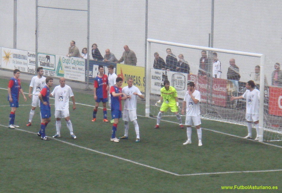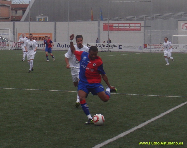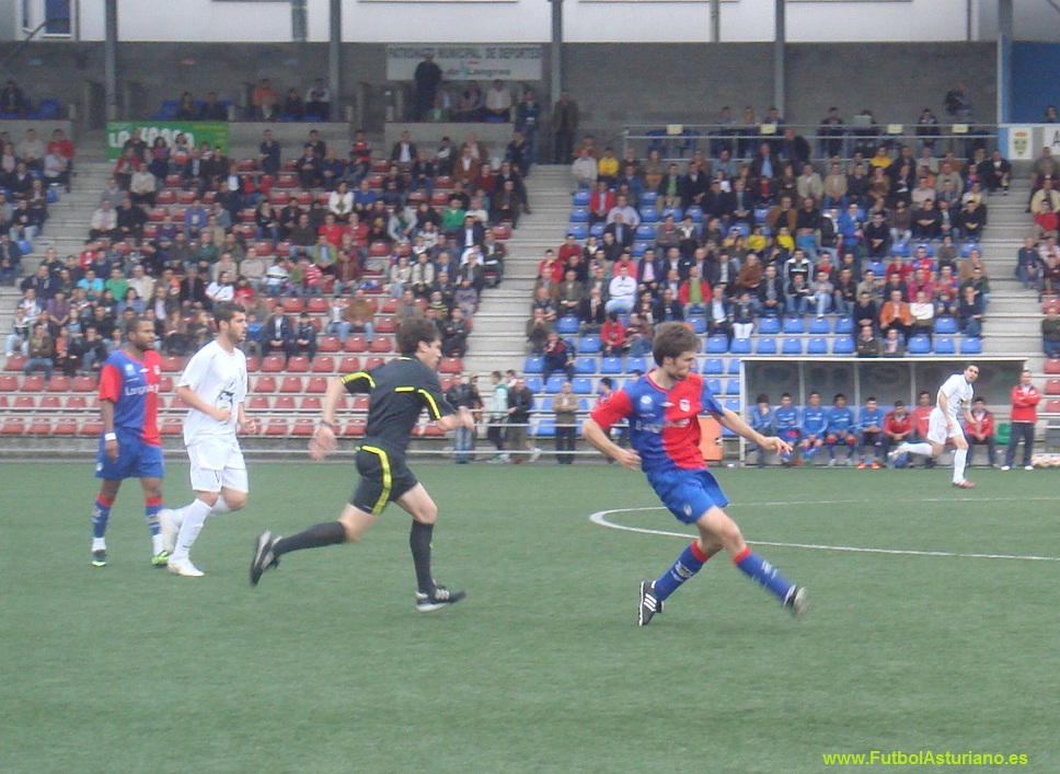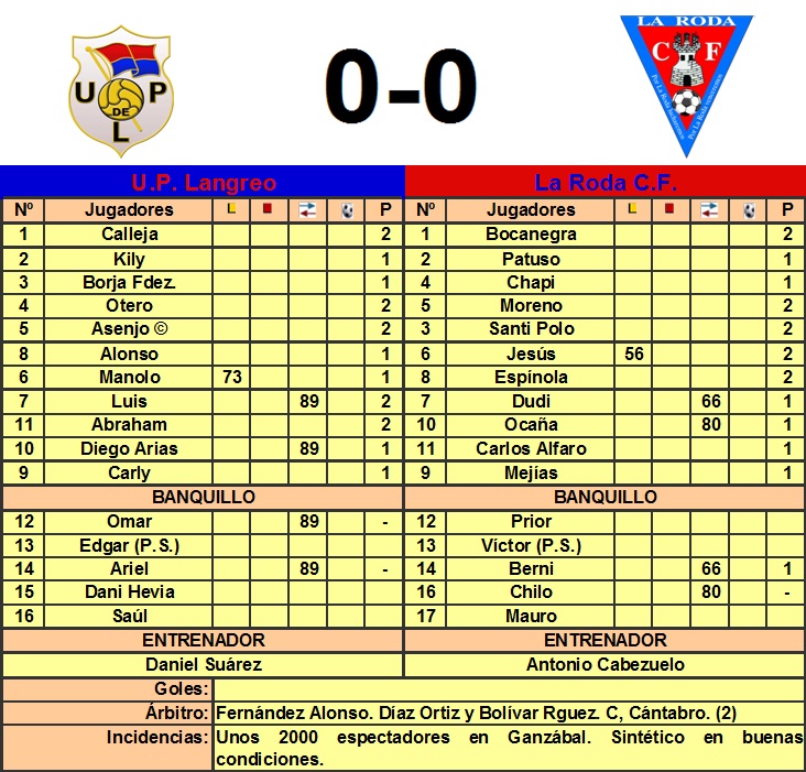 La Crónica: Con una notable presencia de público en las gradas, a pesar de la nula representación de seguidores manchegos, el encuentro disputado esta tarde, ha defraudado, no respondiendo a un choque de la entidad de una promoción de ascenso. El cuadro local, con un once inicial idéntico al utilizado en la liga regular, comenzó bien el partido, cercando la meta de La Roda, disponiendo el interior Luis de una ocasión nada más iniciarse el choque, internada por banda derecha y el cabezazo de Luis se vá fuera. La Roda en esta primera parte, llegó con cierta peligro a la meta de Calleja, liderados en ataque por Ocaña y Mejías, siendo el primero de ellos quien dispondría de la primera ocasión de los albaceteños, mediante un disparo desde corta distancia que se marcha fuera por poco. La mejor ocasión del Langreo y del partido, vendría por medio del brillante y desequilibrante Abraham, que desde el borde del área engancha un trallazo que repele la escuadra de la meta visitante. Con el paso de los minutos el Langreo fue perdiendo fuelle, y los manchegos, bien posicionados, con una condición física envidiable y mucho oficio, se fueron metiendo en el partido, sin pasar excesivos agobios en su parcela defensiva, pudiendo denuevo Ocaña adelantar a su equipo en el marcador, en un remate de cabeza que detuvo Calleja. Con posterioridad, Mejías dispondría de una gran ocasión, con todo a su favor envía el balón fuera de los tres palos, en un estado de partido, en el que al Langreo le costaba combinar y crear peligro, destacando una combinación Carly- Diego Arias, con remate del máximo goleador langreano en la liga regular, que detiene sin mayores problemas el meta visitante. La segunda parte, no respondió a las expectativas, con un Langreo que no inquietó en exceso la meta rival, y un conjunto manchego, que con mucho ofició paró el partido, llevando el juego a su terreno, sabedores de que un empate sin goles les otorga cierta ventaja para el partido de vuelta. Reseñar dos ocasiones en las botas de Luis, destacando un mano a mano con el guardameta rival, en el que el interior azulgrana, pecó de inocencia, y apurado por un defensa, se precipitó en el disparo desaprovechando una gran ocasión para inaugurar el marcador. Las espadas están en todo lo alto, el Langreo no ha estado fino, ante un rival, que demostró ser un buen equipo, aunque tampoco se prodigó en exceso en la faceta ofensiva. Los pupilos de Daniel Súarez deben marcar en La Roda para pasar la eliminatoria, ante un rival con un potencial económico muy superior, en el que la práctica totalidad de sus componentes ejercitan su actividad futbolística en régimen de dedicación plena.