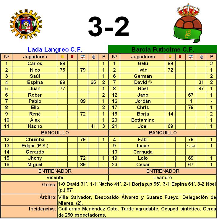 Se esperaba una eliminatoria muy igualada, entre el tercer clasificado del grupo 1 y el segundo del 2. Las reducidas dimensiones del Guillermo Menéndez Coto provocaron un partido muy trabado y con poco juego por ambas partes, marcado por las jugadas a balón parado. La primera ocasión fue para el Lada en el 10’, un disparo que se estrelló en el poste derecho de la portería de Gelu, aunque el Barcia fue quien abrió el marcador, con un gol en el 31’ de falta directa botada por David, el portero del Lada, Carlos, midió mal su salida. Poco duraría la alegría para los de Leandro, que en el 41’ veían como Nacho igualaba la contienda con un fuerte disparo que sorprendía a Gelu, llegándose con el 1-1 al descanso.