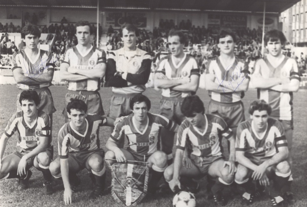 Un equipo del Real Avilés Industrial en su primera temporada. De izquierda a derecha, de pie: Avendaño, Juan Carlos, Viña, Juan Valés, Rúa y Barrero; agachados: Blas, Jesús, Quico, Calvo y José Luis. A la derecha, Juan Muro De Zaro, primer presidente.