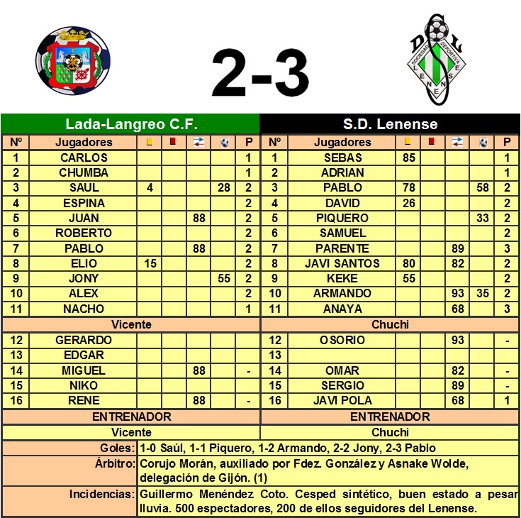 Partido intenso de los que hacen afición, con dos equipos volcados al ataque, con un Lenense muy efectivo de cara a gol, y un Lada que mereció más, enviando dos balones al larguero y anulandóse un gol aparentemente legal.