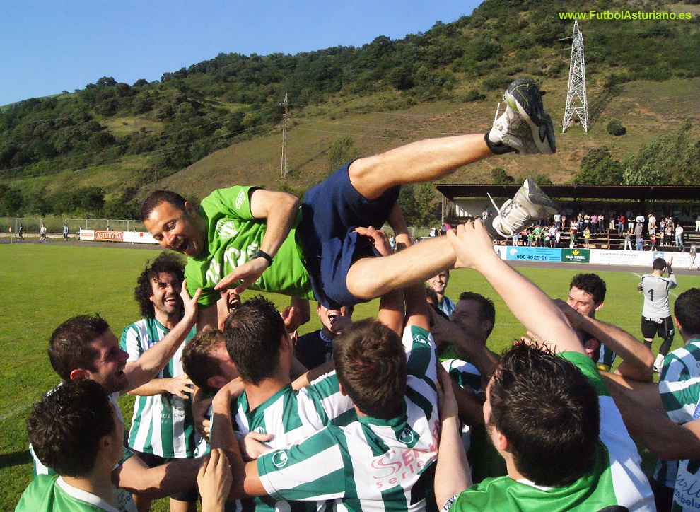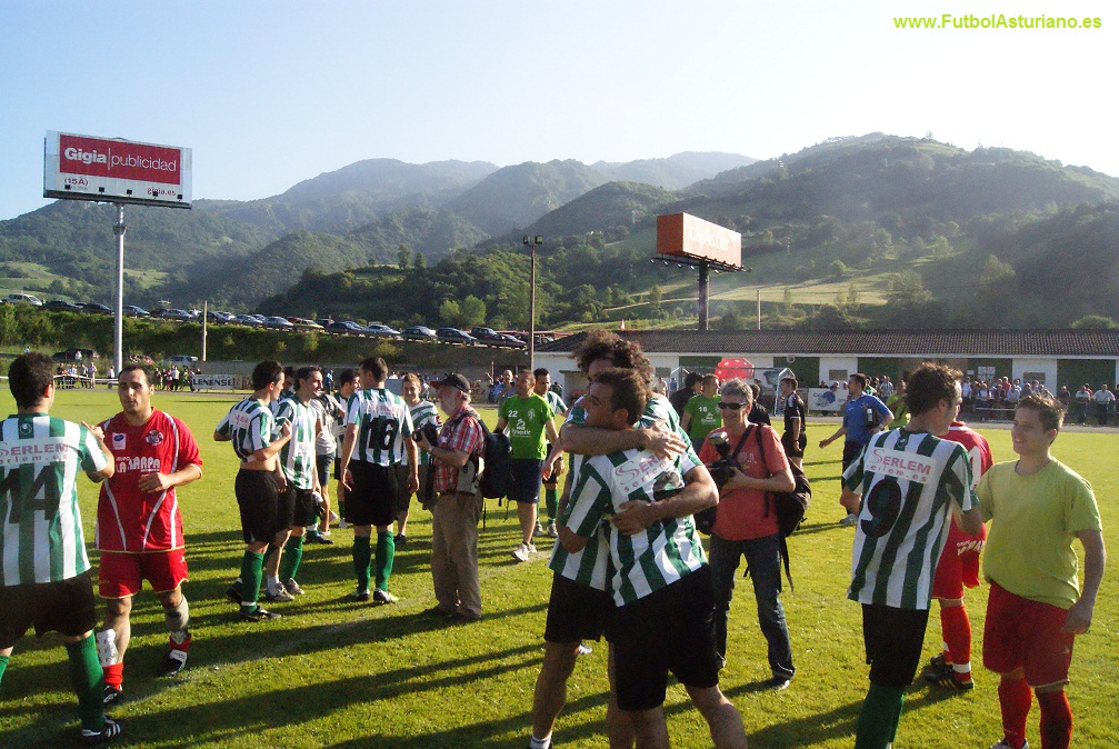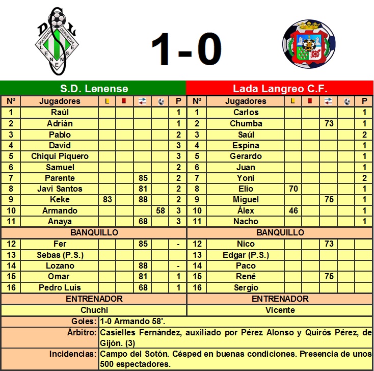 Esta tarde en el Sotón, fiesta del fútbol, con un cuadro local que retorna a Regional Preferente, por un global de 4-2 en la eliminatoria, con un partido de ida igualado y dinámico, y un encuentro de vuelta más soso, considerando justo el ascenso de los pupilos de Chuchi, ante un Lada Langreo, que despachó una buena temporada, pero muy desdibujado en la tarde de hoy. La primera parte fue mala de solemnidad, con un Lada, que tendría que haber salido a morder, visto el resultado del partido de ida, pero que con poca gasolina en el depósito, apenas inquietó a los locales. Esta primera tanda transcurrió con mucho centrocampismo, y escasas aproximaciones al área rival, si bien en los últimos 5 minutos, ambos equipos despertaron, y los visitantes en dos ocasiones por medio de Yony, gozó de buenas ocasiones para adelantarse en el marcador, y por el bando local, Keke, dispuso de una gran ocasión, en una buena acción individual, pero que no pudo definir en un mano a mano con el portero visitante. Se llegó al descanso con el resultado inicial, por lo que los langreanos disponían de 45 minutos para marcar dos goles, y lejos de intentarlo, la segunda tanda fue de absoluto dominio del Lenense, ante un Lada impotente, al que la presión y la condición física pareció pasarle factura. Nada más iniciarse la segunda parte, Keke envió un balón al palo, y antes de cumplirse la hora de encuentro, Armando Quesada clarificaba más aún las cosas: recibe un buen pase de Anaya, que se había internado por banda izquierda, y desde el pico del área bate a media altura al guardameta Carlos, subiendo al marcador el único tanto del encuentro, y sentenciando la eliminatoria. El Lada lejos de reaccionar, tiró la toalla, y se vio superado por el cuadro local, que pudo aumentar la renta en varias ocasiones, reseñar una gran jugada de Keke, que se revuelve en el área y su disparo es repelido por el cancerbero visitante a córner, y con el tiempo prácticamente cumplido, uno de los viejos rockeros, Pedro Luis, que había salido unos minutos antes, con todo a su favor envía un disparo que se va fuera por poco. Al final, júbilo entre la afición local, y sentimiento agridulce en los langreanos, que en la tarde de hoy no estuvieron acertados y no dejaron una buena imagen en Pola de Lena. La S.D. Lenense, nuevo equipo de Regional Preferente, nuestras felicitaciones, deseándoles retornen a épocas pasadas en las que estuvieron en tercera división, y certificar la buena temporada del Lada Langreo, deseando a los langreanos se afiancen como uno de los conjuntos gallitos en primera regional, e intenten de nuevo el salto de categoría.