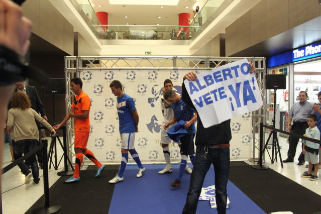 Al contrario que en el Sporting, las equipaciones gustan a nivel general entre los aficionados oviedistas, pero el acto no quedo exento de protestas y ante 150 espectadores, se aprovechó para recordar el rechazo al máximo accionista y presidente del club Alberto González, siendo interrumpido el acto en sus momentos finales y con presencia de la Policía Nacional, que fue llamada por la portavoz del Real Oviedo, Paula Calleja, a la que en la foto se ve correr despavorida en la parte izquierda.