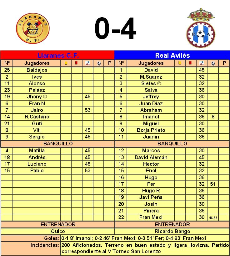 En los primeros instantes de juego el Real Avilés llevó todo el peso de las acciones ofensivas, especialmente con Abraham en banda izquierda, encarando con acierto constantemente, y con Miguel Suárez desdoblando en la banda derecha y poniendo centros al área con mucho peligro. En el minuto 8 llegaría el primer gol del encuentro, obra de Imanol que resolvió por arriba una rápida contra del Real Avilés. En los minutos siguientes Borja Prieto gozaría de hasta 3 buenas ocasiones de poner el segundo tanto en el marcador, desaprovechando todas ellas. Hasta el minuto 23 no llegaría la primera ocasión del Llaranes en pies de Guti, que lanzó un fuerte disparo desde unos 30 metros que se fue a la izquierda de la portería del Real Avilés. A los 30 minutos el Real Avilés sustituto a todos sus jugadores de campo, para darles descanso de cara al partido de Copa Federación. De ahí a final de la primera parte solo destacar unas posibles manos en el área del Avilés, que aunque fueron protestadas por los locales, no señaló el árbitro del encuentro. Nada más empezar el segundo tiempo llegaría el segundo gol del Avilés, obra de Fran Mexi que aprovechó un buen centro de Javi Peña para batir a un Baldajos indefenso. En la segunda parte Javi Peña fue una autentica pesadilla para la defensa del Llaranes, aunque cayendo en muchas ocasiones en fuera de juego. Sería en el minuto 51 cuando llegaría el tercer gol del Real Avilés, obra de Fer, que aprovechó un despiste de la zaga local en un saque de banda para poner un nuevo tanto en el marcador. La mejor ocasión del partido para los locales llegaría en el minuto 74 cuando Guti se plantó solo ante David Alemán, que sacaría sus disparos a quemarropa hasta en tres ocasiones, ganándose el aplauso de la grada. El partido se volvió bastante bronco hasta que en el minuto 83 Fran Mexi marcase su segundo gol de la tarde al regatear al portero local con un amago y empujar el balón desde el punto de penalty. Con el 0-4 se llegó al final del partido, resultado con el que el Real Avilés se convertía en el ganador del V Torneo San Lorenzo. |