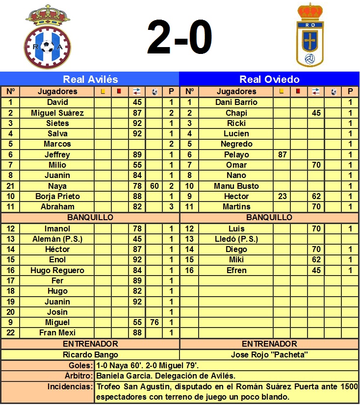 El equipo de la capital del principado presentó un equipo formado por 9 jugadores del primer equipo y completado con jugadores del filial y del primer equipo juvenil. Tras el saque de honor, a cargo de Campanal, se empezó a vislumbrar que el partido no iba a ser cómodo para el Oviedo, ya que sin llegar a los 15 minutos de juego Abraham ya había hecho de las suyas en banda izquierda, primero dando un pase de la muerte a Naya, que este estrellaba contra un defensa y después recuperando un balón ante Owona, para quedarse solo ante Barrio y echarla fuera. 10 Minutos después Owona tenia que hacer alarde de su velocidad para cruzarse ante Naya quien había regateado a Dani Barrio y se disponía a marcar a puerta vacía. La mejor ocasión del Oviedo en la primera parte llegaría a pies de Martins con un remate acrobático que detenía el portero avilesino. Se llegaría al descanso con la sensación de que era el Avilés el que equipo de categoría superior y no el Real Oviedo. En los primeros minutos de la segunda parte, seria Martins quien llevase peligro al área avilesina con hasta 3 buenas ocasiones, todas ellas desaprovechadas.