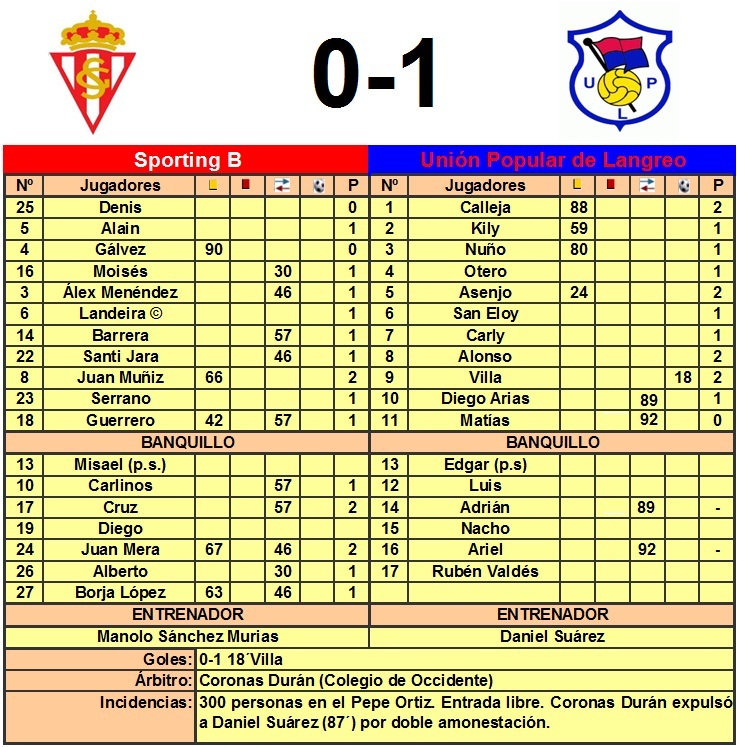 El Unión Popular de Langreo se convirtió en semifinalista de la Copa Federación, a falta del partido que tendrá que disputar ante el Cudillero, tras vencer por la mínima al Sporting B en el Pepe Ortiz. El único tanto del partido llegó a los 18 minutos cuando Denis saca mal de portería y se la envía a Asenjo, quien astutamente se la bombea a Villa quien bate por la derecha al guardameta gijonés. Los rojiblancos, que se habían marcado pasar de ronda tras la nefasta participación de la temporada pasada, lo intentaron casi siempre desde fuera del área, pero tanto Calleja, como la desviación en los disparos, impidieron que el portero del Langreo sacase el balón de entre las redes. La mala noticia se dio a los 30 de juego, cuando Moisés se retiraba lesionado tras recibir un fuerte golpe en el tobillo, por lo que podría convertirse en duda para el primer partido liguero ante el Real Madrid Castilla. En su lugar entró Alberto, aunque en ese momento el partido dejó de ser un mero encuentro de Copa Federación y pasó a ser un duelo predominado por la tensión y la dureza. Prueba de ello fueron las 9 tarjetas amarillas que mostró Coronas Durán a los jugadores y su decisión de expulsar a Daniel Suárez del banquillo. Parecía que habían quedado asuntos sueltos del partido de ida, donde rojiblancos y azulgranas empataron a uno, y todo indicaba que el Pepe Ortiz era el escenario elegido para saldar las deudas del duelo de ida. El choque se volvió más bronco. Las 300 almas que se acercaron a Mareo presenciaron un segundo tiempo sin apenas juego, y donde Cruz dispuso de las actuaciones más claras para poner las tablas en el marcador pero siempre desde fuera del área.
