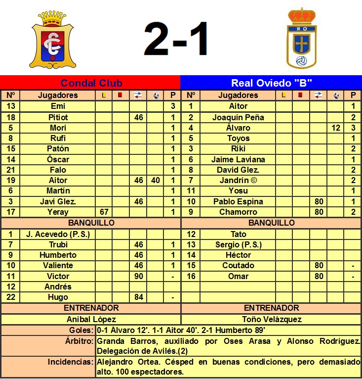 Sólo le valía ganar al Condal, que acudía a la cita vivo tras el empate en el Requexón el domingo entre el filial oviedista y el Candás. Aníbal llegaba con las bajas de Bruno, Herrero y Cristian lesionados, además de Íker Lasarte, que se perdió el partido por motivos laborales. Velázquez -que volvía a los banquillos tras tres partidos de sanción-, además de al lesionado Davo, tenía tres sancionados, Adrián Torre, Robert y Jaime Laviana, aunque éste último se libró de la expulsión del domingo por una confusión a la hora de redactar el acta del colegiado, que endosó la sanción a Héctor Méndez, delantero del juvenil, que a la postre se perderá los dos primeros partidos de División de Honor por este error. El partido comenzó bastantes minutos por detrás de la hora. Se guardó un respetuoso minuto de silencio por el fallecimiento del socio condalista, Sergio Puente. El Oviedo salió como una locomotora que embotelló al Condal en su área, con buena circulación y continuos ataques desde la derecha con Jandrín como protagonista. En el primer minuto, Chamorro remataba alto un buen servicio de Jandrín desde dentro del área. Al minuto después, el auxiliar, Alonso Rodríguez, anuló un gol por fuera de juego a Jandrín, tras regatear a Emi. El filial podía ir ganando por 0-2 en estos primeros minutos, aunque no tardó en llegar el 0-1, un córner botado por Chamorro, que llega al segundo palo, lo aprovecha Álvaro Cuello -foto 2-. El dominio azul no se trasladó a más ocasiones, y poco a poco el Condal cogía presencia en el partido, teniendo Martín su primer disparo tras un pase de Rufi, fruto de una jugada ensayada a balón parado. La defensa carbayona jugaba en el centro del campo, quizá para habituar a los jugadores al juego del primer equipo, y así llegó el empate, un saque de Emi que pasa por encima de la defensa y lo aprovecha Aitor para batir al otro Aitor, debutante en la portería azul. Salieron fuertes los de Velázquez en la segunda mitad, a pesar y Emi se convirtió en el protagonista de la victoria. En el 58' un córner de Chamorro se estrellaba en el poste y cinco minutos después, el propio Chamorro desde la frontal, obligaba a lucirse a Emi que enviaba a córner, misma jugada que en el 69', cuando Pablo Espina recortaba hacia dentro y Emi se estiraba para enviar a córner. El Oviedo no consiguió materializar sus ocasiones y se fue desinflando. El Condal pudo anotar en el 74' y 76' con dos acciones ofensivas de sus laterales, primero fue Pablo Patín que se plantó ante Aitor y envió su remate al lateral de la red y luego Trubi, al que le ganó la partida el guardameta. En el 83' Jandrín tuvo la ocasión más clara, pero falló en la definición después de tener regateado a Emi. En el 89' una falta lateral botada por Valiente la empuja Humberto en el área pequeña dando la vuelta en el marcador y consiguiendo una importante victoria para los de Aníbal López, que se mostró bastante decepcionado con el juego de su equipo. |