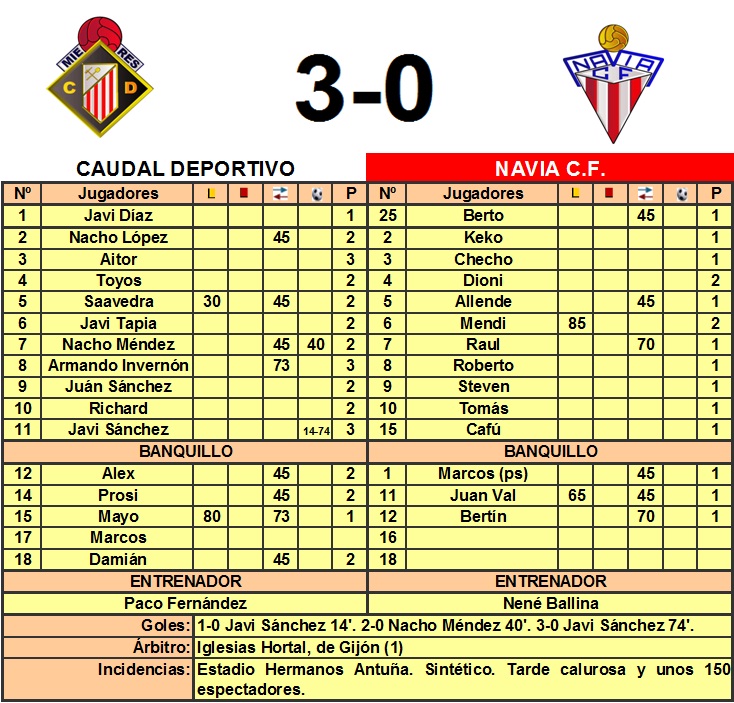 El mister local, a pesar de estar ya clasificado para la semifinal de Copa, no se tomó el partido a título de inventario, si no que sacó el 11 que puede ser el titular de cara al inicio de liga. Con esa alineación y dado que el Navia, ya inferior tanto en juego como en nombres, le faltaron Dieguito y Martínez, además de las características del campo de juego, amplio y sintético, poca resistencia ofreció al conjunto mierense.Los naviegos dieron la cara, mientras duró la condición física y el marcador se mantuvo 0-0, pero a medida que fueron llegando los goles, la diferencia en el terreno de juego se amplió. En el min.18 se produjo el primer gol, en una jugada de Aitor por la izquierda y cuyo centro fue rematado a la escuadra, de certero cabezazo por parte de Javi Sánchez y en el min.40 llegó el 2-0 al aprovecharse Nacho Méndez de unos rebotes en el área y anotar, eso si, con clase y frialdad el segundo gol, gol no celebrado quizás por su ascendencia naviega. El Caudal tuvo el balón pero esas 2 llegadas fueron todo el peligro, pero fueron dos goles.