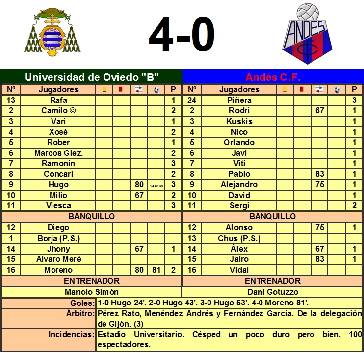 Un hattrick de Hugo da la victoria a los de Manolo Simón, muy superiores a un Andés muy joven y muy blando. ![]() El Universidad "B" con bastantes caras conocidas del año pasado se impuso a un Andés, que pese a ser un recién descendido, los reajuste del equipo naviego le llevarán a pelear para mantener la categoría. El partido fue de claro color estudiantil, los de Manolo Simón gozaron de muchas ocasiones y el resultado pudo ser más abultado de no ser por la presencia del veterano Piñera -hoy de amarillo- que evitó una goleada mayor. En el minuto 3', Viesca -jugador llegado del Alcázar juvenil- pudo abrir el marcador, pero el meta naviego le ganó la partida, al igual que en el minuto después a Ramonín. Los dos equipos intentaban jugar un fútbol de toque, pero la calidad era superior en los locales, que en el 20' disfrutaban de una nueva ocasión de gol en botas de Ramonín y que atrapaba bien Piñera, cosa que no pudo hacer en el 21', una buena jugada de Ramonín finaliza con el pase de la muerte para Hugo, que sólo tuvo que empujarla a la red. En el 32', Vari de falta permitía nuevamente lucirse a Piñera. En el 43' Una jugada de Viesca dejaba sólo a Hugo ante el meta visitante y establecía el 2-0. Tras el descanso, el Andés pudo recortar distancias, un falló de Rafa en una cesión lo desaprovechó Sergi, que junto a Piñera, fue el mejor de los naviegos. En el 61' una buena jugada de Viesca la desbarata Concari que podía sentenciar el partido. Hugo conseguía el 3-0 con un gol tras pase de Ramonín. El Andés estaba pecando de muy blando y con muchos jugadores debutantes en la categoría, algo de lo que se aprovechó el equipo estudiantil. En el 81' un disparo de Concari que golpea en el palo, lo aprovecha Moreno, recién entrado al campo, para cerrar el marcador con un contundente 4-0. El