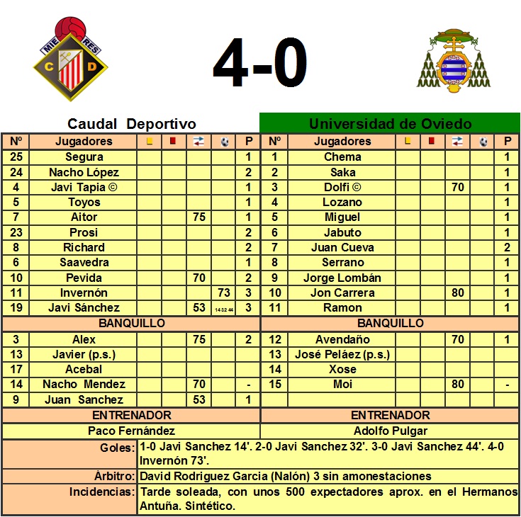 Un espléndido Javi Sánchez, que firmó un hat-trik prácticamente sin despeinarse, amargó el día a los discípulos de Pulgar. Los mierenses fundamentaron su ataque principalmente con las llegadas por banda derecha y con la incorporación al ataque de Nacho López, realizando un buen trabajo con Pevida y por la izquierda un soberbio Invernón. Juntos dejaron k.o al Uni en 45 minutos. Paco sorprendió y acertó con una defensa de 3 centrales y con dos carrileros muy adelantados. Resultado demasiado abultado para los méritos de unos y otros, resultando paradójico, ya que la goleada pudo haber sido mayor, el Caudal tuvo dos claras ocasiones de gol en la segunda parte que no transformaron ni Pevida, ni Juan Sánchez. Difícil salida la que les espera a los hombres de Paco, que visitarán el Suárez Puerta de un Avilés herido, tras el empate en La Roja. Será el domingo a las 19.00 h. El Universidad recibe en casa al Colloto.