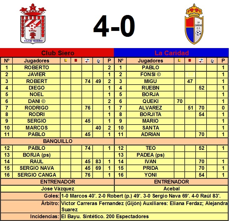 A partir de aquí, cabe destacar que La Caridad no tiró la toalla y siguió jugando mejor que su rival. Al Siero le bastaba con esperar y salir a la contra aprovechando su superioridad. Así llegaría el 3-0 en el minuto 69 por medio de Sergio Nava y ya en el 84 Raul en jugada personal anotaría el cuarto. Partido sin historia que sirve para colocar al Siero en posición privilegiada tras la primera jornada de Liga. Fotos: