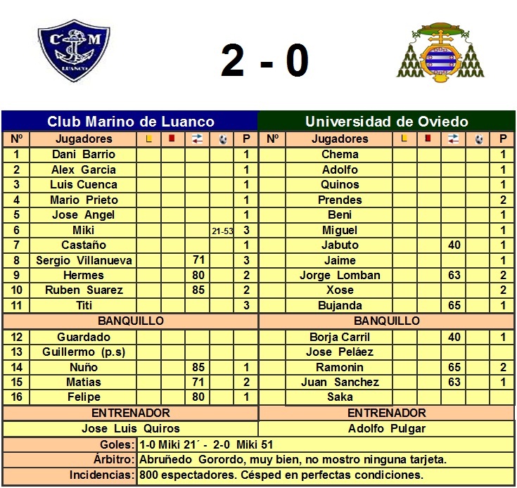 Del partido poco que comentar, un planteamiento ultradefensivo el puesto en escena por Adolfo Pulgar, el cansancio de sus hombres por el reciente campeonato universitario, hizo replantear el sistema habitual del Uni por un 5-3-2 jugando con 3 centrales. Las numerosas ocasiones del Marino solo se materializaron en dos goles de Miki en los minutos 21 y 53. Al final el Marino asegura su clasificación para los play-offs. Anotar el cambio de Jabuto en el minuto 40 de la primera parte por problemas musculares.