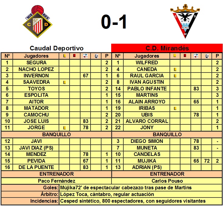 El Caudal deportivo se complica más aún sus aspiraciones de permanecer en la división de bronce del fútbol nacional, pues en la tarde de ayer, pagó como es habitual su desacierto de cara a gol, no habiendo sido inferior al Mirandés, y gozando de bastantes ocasiones para batir al gran guardameta Wilfred.