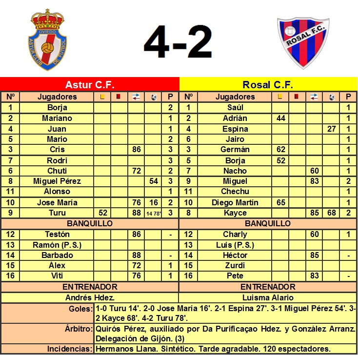 Muy buen partido entre el Astur y el Rosal, donde los locales dieron un recital de fútbol con muy buen juego. Turu bigoleador.