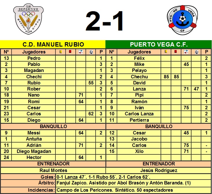 Durante los primeros quince minutos se vio al equipo visitante más asentado en el terreno de juego, mientras que el Manuel Rubio se intentaba acomodar al partido, yendo de menos a más a lo largo del partido. La primera ocasión la tendría el equipo local, con un buen centro desde la derecha de Pablo, buen desmarque de Rubo rematando de primeras con la izquierda pero el disparo se fue alto. Buen partido del lateral derecho que constantemente estuvo insistiendo con centros desde atrás, y también de Rubo quien fue un quebradero continuo para la defensa visitante. Respondería el Puerto de Vega en el 15´con un buen robo de balón de Ramón que jugó con Carlos Lanza quien dio un pase de primeras a Iván, que ganó la espalda a la defensa pero su tiro fue bien despejado por el portero local. Poco después, se vive una jugada similar Iván, tras un buen pase de Pipi, la cruzará en exceso ante la salida de Pedro. El Manuel Rubio se veía más nervioso que su rival y no lograba acercarse al área rival con claridad, solo pudo aprovechar las jugadas de estrategia que se pudo ver que están bien trabajadas. En uno de estos córners en el 25´Rober remato al larguero. En la siguiente jugada el Puerto Vega trenzó un bonito ataque, Ramón jugó hacia la banda desde donde Pertierra le puso un balón a Pipi que envió su disparo alto. El equipo visitante se mostraba muy sólido en defensa, sobre todo la pareja de centrales, mientras que el Manuel Rubio a pesar de controlar el medio campo, Rubo, como único delantero, se veía incapaz de hacer daño al rival. Al descanso el Puerto Vega realizó un cambio Cesar sustituyo a Mike, quien se hizo daño antes del descanso al chocar contra una valla de publicidad al intentar salvar un saque de banda. La segunda parte empezó de cara para el equipo visitante, en un balón dividido Lanza despejó el esférico con la fortuna de que se dirigió a portería entrando por la escuadra ante la posición adelantada del portero. Este gol hizo que el Manuel Rubio despertara y empezara a controlar el partido y a acosar al rival, en el 50´Pablo sacó una falta desde la izquierda al pie del área que obligó a Felix a demostrar sus buenos reflejos, primero al remate de Rober, y al psoterior disparo de Magadan que no pudo aprovechar el rechace. En el 55´Diego pone un buen centro desde la derecha para que Rubo marque con un buen remate de cabeza, el Manuel Rubio empataba el partido. En el 60´Rubo peleó un balón en la banda izquierda su centro fue rematado por Romi despejando el portero a córner. En el 62´llegó el segundo gol del Manuel Rubio, un balón largo para Rubo en la banda izquierda pone un centro pasado, Pelayo no acierta a despejarla y Carlos aprovecha para superar al portero. El partido continuó con el dominio local. Mientras el Puerto Vega veía crecer el nerviosismo entre sus jugadores, a pesar de alguna ocasión como la falta lanzada por Carlos Lanza desde la frontal del área que pasó rozando la escuadra. El Manuel Rubio continuó acosando al Puerto Vega, llevando peligro en los córners y con los balones largos puestos desde atrás, pero sus tiros se iban altos o eran detenidos por Félix. En el 85´Chechu fue expulsado por protestar al árbitro, que le mostró dos amarillas seguidas. El Manuel Rubio aún tendría un par de ocasiones pero primero Rubo que envió alto el buen pase de Rober. Y ya en el descuento, Adrián se internó al área desde la derecha pero el mano a mano fue bien resuelto por el portero visitante, que hizo un buen partido a pesar de los goles recibidos. En conclusión, buen partido de ambos equipos con ganas de jugar y buen ambiente entre ambos. El arbitraje fue protestado por el Puerto Vega, pero tampoco tuvo complicaciones y estuvo correcto.