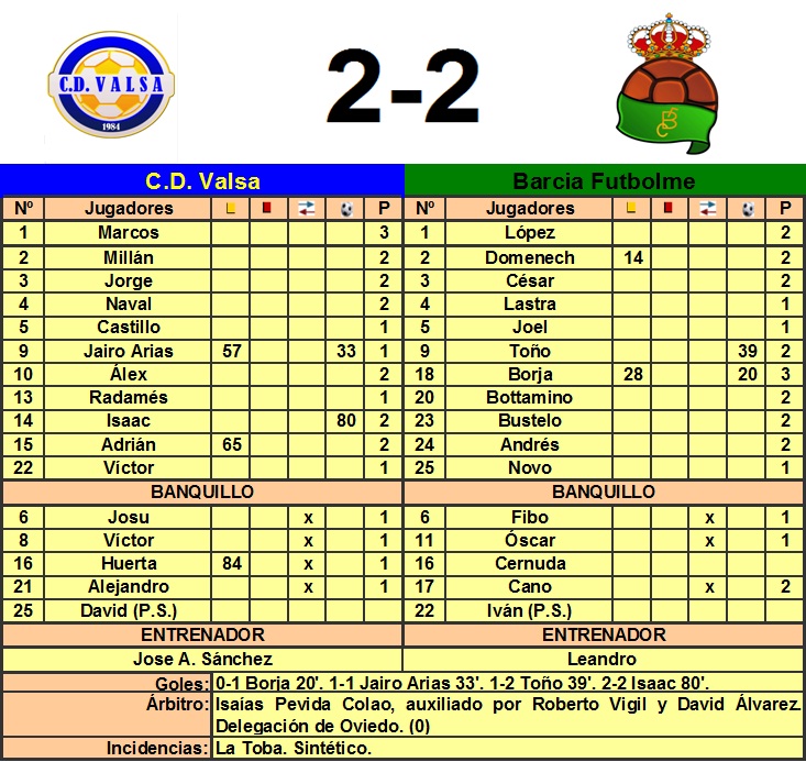 Buen partido el disputado en La Toba. Dos equipos que ofrecieron un buen fútbol, disfrutando de ocasiones de gol y sin perder la cara al partido en ningún momento. El Valsa llevó el peso del partido, aunque su posesión no se transformó en ocasiones de peligro más allá de sus llegadas a balón parado. El Barcia por su parte, esperaba y salía a la contra, en una de ella llegó el 0-1 obra de Borja. Los locales empataron a raíz de una falta lateral rematada por Jairo Arias en posible fuera de juego.En otra jugada a balón parado, sería el Barcia quien se volvería a poner por delante en el marcador con el gol de Toño y pudieron ampliar distancias, pero el desacierto de sus delanteros evitó que pudieran sentenciar el partido, aunque también hay que destacar la labor del portero local, que evitó el gol en dos ocasiones a Bustelo y otras dos a Borja. El que perdona lo acaba pagando, y en el minuto 80 llegó el empate. Una jugada de estrategia en un saque de banda del Valsa, da lugar al 2-2, obra de Isaac. El Barcia buscó la victoria y en el 95 Cano en jugada individual intentó simular el soberbio gol de Ronaldo en el campo de San Lázaro al Compostela, pero se quedó en un intento, fallando ante Marcos. Al final buen resultado para los dos equipos, que suman su primer punto en liga.