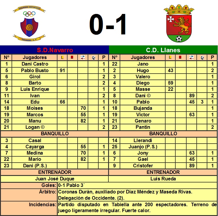 Tras el gol visitante, el partido se convirtió en una consecución de imprecisiones por parte de ambos equipos. Por parte de los locales, Girol no lograba conectar con Barto y Moisés en las bandas, con lo la mayoría de los pases eran lanzamientos en largo, fáciles de defender por parte de Valero y Diego. Los visitantes, con el marcador a favor, se limitaban a buscar la velocidad de Dani y Pantin, pero sin lograr conectar jugadas de peligro. Fruto de los errores en el centro del campo del Navarro llegaba una buena ocasión para los visitantes, en el minuto 24 Luis Enrique perdía un balón en el centro del campo ante Pablo que cedía para Pantin quien conectaba un fuerte disparo que se iba junto a la cepa del poste izquierdo. Apenas un minuto después de nuevo Pantin recogía un pase en profundidad de Bujanda y Dani Castro despejaba gracias a una salida apurada. Eran unos buenos minutos para el Llanes, pero el entrenador local decidió cambiar de banda a Barto y Moisés, pasando a Barto a la izquierda, donde logró llevar mas peligro, sin embargo la mejor ocasión antes del descanso seria para Bujanda quien se encontró un balón botando en la frontal del área, su fuerte disparo con la zurda fue despejado acrobáticamente por Dani Castro. Con el 0-1 se llegaba el descanso. La segunda parte apenas aportó ocasiones digna de reseñar. El Navarro luchaba por llegar al área contraria, gracias a Barto por la izquierda y a Moisés por la derecha. Fruto de esas entradas por las bandas, Moisés centraba un balón desde la derecha en el minuto 50 y Barto en el segundo palo voleaba el balón arriba y 5 minutos después Busto conectaba un fuerte disparo desde la frontal tras el rechace de un corner y Jano detenía el lanzamiento en dos tiempos. El Llanes pudo resolver el partido en el minuto 61 cuando un fallo de coordinación entre Logan y Dani Castro hacia que el centro de Gael se pasease por el área pequeña hasta que Busto despejaba casi sobre la línea de gol. La mejor ocasión para el Navarro llegó en el minuto 71 cuando Chema Logan llegaba desde la defensa hasta la frontal del área llanisca y su fuerte disparo cruzado se iba por poco junto al poste izquierdo de la portería de Jano. Desde ese momento el Navarro buscó mas el ataque, pero sin lograr buenas ocasiones de gol hasta el final.