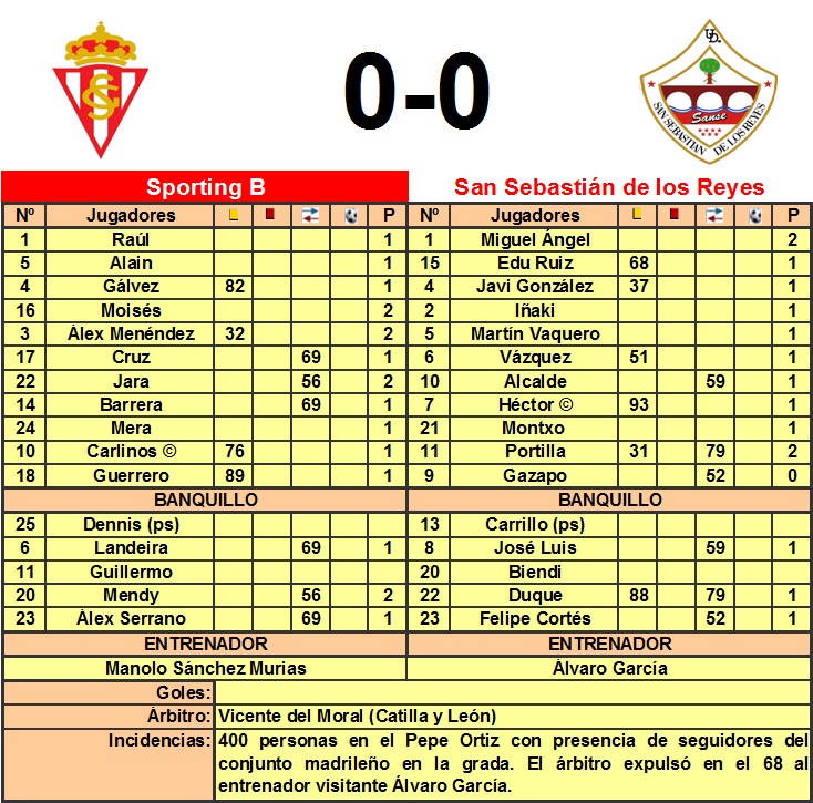 La plantilla del Sporting B estaba deseosa de poder brindar su primer triunfo de la temporada ante su afición, pero la falta de acierto de cara a la portería contraria impidió que los de Manolo Sánchez Murias sumasen los tres puntos en un partido en el que todo le venía de cara. El filial gijonés comenzó el encuentro dominando a un San Sebastián de los Reyes muy bien plantado sobre el terreno de juego y que siempre sacaba el balón de manera jugada, huyendo del típico patadón tan presente en la Segunda B. Los rojiblancos basculaban bien el juego tanto por las bandas como por el centro, pero casi siempre las ocasiones llegaban a balón parado. A los cuatro minutos, Álex Menéndez de volea dio el primer aviso a la portería madrileña tras un saque de esquina. Los asturianos tenían pelota, pero cuando la tenían los franjirrojos apenas generaban peligro. En el 28, Álex Menéndez sacaba un balón en falta que Cruz envía por encima de la portería arrancando los primeros aplausos de la grada. Otra ocasión clara la tuvo Santi Jara, al no lograr golpear el balón cuando el cancerbero visitante ya estaba batido. La última antes del descanso la gozó Guerrero quien remató de cabeza a puerta, pero Javi González la saca bajo la línea de gol. En el segundo periodo, el Sporting B seguía siendo el que tenía más oportunidades para perforar la meta contraria. Prácticamente cada ataque se convertía en un saque de esquina, por lo que las ocasiones se multiplicaban. En el 56, los gijoneses reclamaron penalti por una mano de un zaguero madrileño, pero el colegiado Vicente del Moral se desentendió. Acto seguido. El Sanse tuvo su ocasión más clara en una galopada del extremo zurdo Portilla, quien no logra golpear con fuerza el balón atrapando sin problemas Raúl. El Sporting B lo seguía intentado pero cada vez más, el equipo de Álvaro García (expulsado en el 68) se iba encerrando más. La última ocasión clara para los gijoneses la tuvo Álex Menéndez en el 75. El canterano envió un zurdazo a la cruceta, pero una providencial mano de Miguel Ángel enviaba el balón, como no, a córner.
