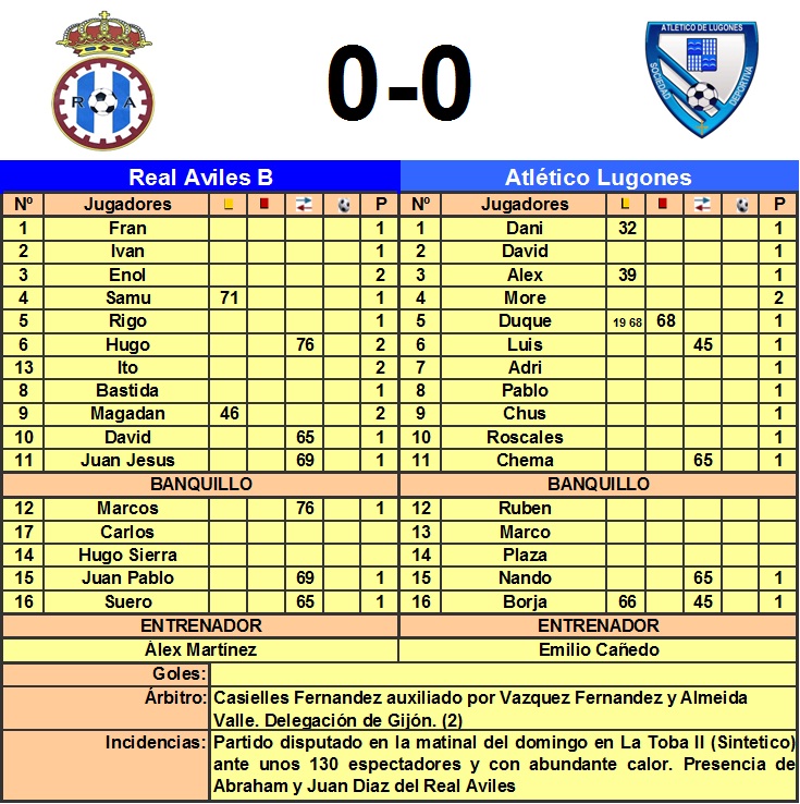 El partido era una consecución de imprecisiones por parte de ambos equipos, donde el filial avilesino no lograba encontrar a Hugo en el centro del campo y los ataques de los de Lugones eran cortados por unos acertados Enol y Samu. La primera ocasión del filial blanquiazul llegó en el minuto 27 cuando Bastida ponía un buen pase en profundidad para Magadan quien disparaba a pesar de la presión de un defensa visitante, su disparo se iba lamiendo la cepa del poste izquierdo de la portería de Dani. La respuesta visitante llegó en el minuto 29 cuando Adri encadenaba una buena jugada por la banda antes de ceder a Roscales quien golpeo con la zurda y su disparo salió fuera por poco. La ultima ocasión de la primera parte seria para los locales, cuando Rigo lanzaba una falta desde la banda izquierda del ataque local, el balón se paseó por el área pequeña sin encontrar rematador. De esta forma llegaba el descanso. Durante el segundo tiempo el Atlético Lugones pareció salir con más ganas, gracias a Borja, que salió al descanso, y cuya presencia entre líneas pareció desconcertar a la defensa local. El propio Borja disfruto de la mejor ocasión del partido cuando controló con el pecho un corner botado desde la izquierda, pero su fuerte disparo se encontró con el cuerpo de Rigo, que salvaba a su equipo de recibir un gol, que parecía claro. En el minuto 50 el propio Borja entraba por banda derecha hasta la línea de fondo, dando el pase de la muerte al interior del área donde Chus la enviaba fuera por poco. Poco a poco los locales parecían encontrar la forma de rehacerse y en el minuto 66 Magadán controlaba de espaldas a la portería en la frontal y su disparo a la media vuelta era resuelto con apuros por Dani. En el minuto 69 llegó la jugada que marcaría el partido cuando Duque era expulsado por doble amarilla, a partir de ese momento los locales solo buscaban el ataque con las entradas desde atrás de Magadán y la velocidad vertical de Ito, pero no lograron ocasiones claras de gol. Los visitantes con uno menos, dieron por bueno el punto. Fotos: Ver Álbum |