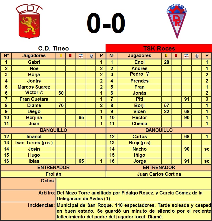 Flojo encuentro el que disputaron en el Municipal tinetense dos de los gallitos de la categoría, en un partido en el que hubo demasiado respeto entre ambos y que defraudó a los numerosos espectadores que acudieron a San Roque. Si bien la primera oportunidad fue para los gijoneses en el primer minuto del partdo después de una falta sacada por Piti y que Prendes cabeceó por encima de la portería de Gabri, fueron los discípulos de Frolilán los que disfrutaron de más ocasiones a lo largo del partido. En el minuto 7 Cuétara lanzaba un disparo que salía junto a palo derecho de Enol, minutos mas tarde, una salida fuera del área con el balón del guardameta visitante propiciaba una peligrosísima falta a favor del Tineo que Fran Cuétara lanzaba a las nubes cuando se hallaba en una inmejorable posición para conseguir algo positivo. En el minuto 27 un zurdazo de Juanin y Enol que toca lo justo para enviar a corner. Y en el 32 otro disparo de Cuetara flojo, se le escapa el balón a Enol con la fortuna de que el balón sale junto a su palo derecho. La segunda mitad fue, si cabe mas aburrida aunque también hubo alguna tímida ocasión para los dos equipos, y así en el primer minuto de la segunda parte un buen centro de Cuétara para Diego que dispara y detiene Enol. La gran oportunidad visitante corrió a cargo de Chema en el minuto 51 cuando tras una gran jugada y centro posterior de Piti era rematado por Chema y el balon se estrella en el pecho de Marcos Suárez cuando el balón iba directo a porteria. Y el Tineo tuvo las dos ultima ocasiones y muy claras por cierto en la botas de Diego que en el minuto 59 tras un gran pase al hueco de Cuétara dispara solo ante Enol y envía el balón a las nubes. Y la última la tuvo Diame que tras deshacerse de varios contrarios en jugada personal por la banda, se adentra en el área y sólo ante Enol dispara con la izquierda fuera. En