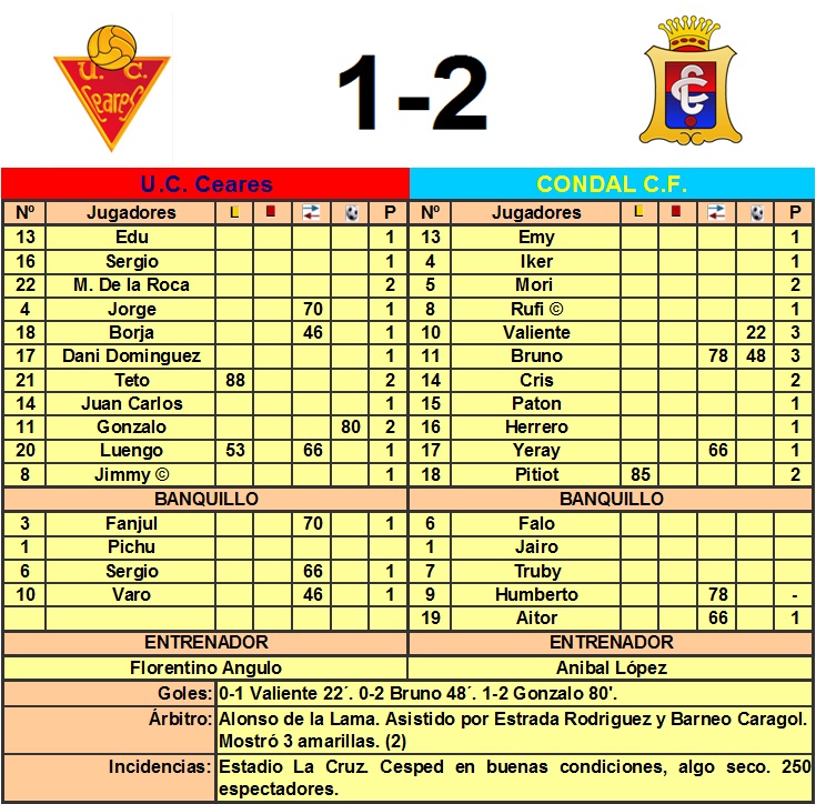 La primera ocasión sería para los locales en un balón que aguanta Jimmy en la banda derecha ante el acoso de los defensas, logra poner el balón para la subida de Sergio quien centrara el balón desde el fondo de la banda para que remate Dani Domínguez de cabeza, pero el balón se pierde rozando el larguero. Respondería el Condal, con su primera y única ocasión de claro peligro en la primera parte, Cris avanza apurando la banda derecha su centro pasado no acierta a despejarlo Sergio situación que es aprovechada por Valiente para controlar y cruzar el balón desde dentro del área, gol para el Condal. El resto del primer tiempo se desarrollo entre las imprecisiones y continuos robos de ambos equipos intentando acercarse al área rival pero sin lograr concretar ocasiones de peligro. La segunda parte comenzó con el segundo gol del Condal, saca de banda el Ceares el balón es robado por Pitiot que realiza un pase hacia Valiente quien juega de primeras hacia el desmarque de Bruno quien remata con la derecha ante lo que anda puede hacer Edu. Jarro de agua fría para el Ceares que a partir de entonces se echó arriba con mas coraje que cabeza, lo que fue aprovechado por el Condal para intentar cerrar el partido a la contra. En el 51´ Bruno pelea el balón en la banda derecha le pone el balón a Valiente quien se revuelve en el área sacando un disparo que obliga a una buena estirada por bajo de Edu. El Ceares se acercaría al área rival en el 10´un balón sacado desde atrás por Jorge sería peleada por Juan Carlos con el portero provocando el fallo de este en el despeje, pero Luengo no puede aprovechar que la portería está vacía por la asfixiante presión de la defensa. El partido avanzó al igual que la primera parte en un continuo toma y daca en el medio campo pero sin peligro para los porteros. En el 78´ el jugador visitante Cris se interna por la banda derecha dándole el balón a Valiente quien dispara desde la frontal siendo su remate repelido por el larguero. Dos minutos después veríamos el mejor gol del partido, falta en la esquina derecha del área a favor del Ceares, Gonzalo coloca el balón y la golpea durísima con la pierna izquierda, el balón se cuela por la escuadra contraria sin que el portero pueda hacer nada. Este gol trajo las esperanzas de un empate a La Cruz y los nervios para el Condal, pero las acometidas del Ceares completamente volcado en el área rival no se materializaron en ocasiones de peligro. Finalmente el Condal logró la victoria ante un Ceares que sigue sin saber lo que es puntuar en esta temporada. El árbitro del partido Alonso de la Lama y sus asistentes pasaron completamente desapercibidos por el partido, lo cual es señal de que cumplió correctamente con su cometido, no hubo ninguna jugada polémica y el juego por lo general fue limpio.