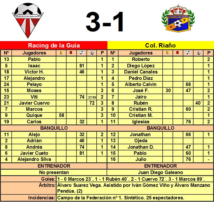 En el 35´el Riaño vuelve a tener una ocasión a balón parado el balón centrado por Cristian M. es rematado por Cristian R. que obliga a una buena intervención de Pablo. En el 40´ llegaría el empate, un córner despejado por la defensa local es recuperado por Jairo el balón es bajado por Rubén aprovechando su corpulencia, abriendo hacia la banda para que José ponga un centro medido para que Rubén remate con la cabeza y la aloje en el fondo de las mallas. Bonito partido por parte de ambos equipos que mostraron gran intensidad pero limpieza en los choques y entradas. La segunda parte sería de dominio absoluto del Racing ante un Riaño que fue acusando cada vez más el cansancio. Los primeros quince minutos al igual que en la primera parte fueron de tanteo con un juego continuo en el mediocampo, en el 60´ Marcos juega a la izquierda para la internada de Cuervo que centra al segundo palo donde el remate de cabeza de Quique obliga a una buena intervención de Roberto. En el 63´ una jugada calcada, centro de Cuervo por la izquierda desde la línea de fondo es enviada por Quique rozando el larguero, muy voluntarioso y luchador el delantero local que fue un continuo peligro y no se cansó de presionar. Cuervo fue un cuchillo por la banda izquierda mientras Marcos dio gran criterio en los pases y a nivel ofensivo, bien respaldado por el trabajo defensivo de Moses un auténtico muro en su posición de medio defensivo. Eran los mejores momentos de los locales y el gol parecía estar a punto de caer, casi llega en el 65´ cuando en un córner el balón cae a los pies de Marcos quien dispara a la cruceta el rechace le cae a Quique que en el área pequeña no logra empujarla por la presión de los defensores. En el 72´ llegó el 2 – 1, Cuervo vuelve a entrar en el área por la banda izquierda aprovechando su velocidad regatea a Pedro y Daniel (lateral y central izquierdo del Riaño) y con un disparo raso supera al portero rival. La respuesta no se hizo esperar y tras el saque de medio, Iglesias penetró por la banda derecha pero cruzó en exceso el balón.