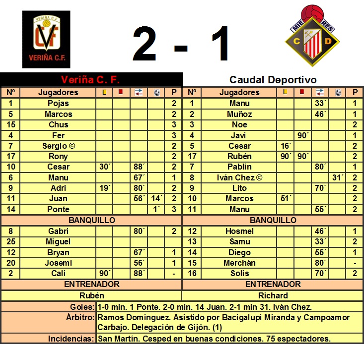En la segunda parte el Caudal siguió manteniendo el control del medio campo, neutralizando sobre todo a Cesar pero Rony empezó a entrar más en juego haciendo valer su físico y poniendo en más dificultades al Caudal. Sería Rony quien tendría la primera ocasión de peligro a favor del equipo gijonés, con un remate a la cruceta desde la frontal. En el 53´una internada de Juan por la banda izquierda es bien abortada por Cesar cuando el jugador local se disponía a disparar dentro del área. El Caudal intentaba acercarse al área rival pero chocaba continuamente con la solida defensa del Veriña, muy segura sobre todo por alto. En el 65´ Pablín entró por la banda derecha y su cambio de orientación no pudo ser aprovechado por Noe que disparó rozando el larguero. En el 67´entró Bryan para reforzar el medio campo pasando Adri a la banda derecha dejando a Ponte solo en punta. La entrada de este jugador de refresco dio más fuerza al Veriña en el medio campo. Continuo el partido en una lucha continua en el centro, intentando ambos dar un golpe de efecto al partido, el Veriña para matar el partido y el Caudal intentando empatar. En el 85´Sergio botó un córner que fue rematado por Ponte al larguero el rechace no pudo ser aprovechado por Cesar cuyo disparo fue despejado con la mano por Javi, algo que no vio el árbitro. En el descuento el Caudal dispuso de una última ocasión a balón parado el disparo de Iván Chez fue bien despejada por el portero. El partido acabó con un rifirrafe entre Ponte y Rubén, el delantero choca involuntariamente con el defensa, que recibe una amarilla, los jugadores de ambos equipos empiezan a discutir terminado con la expulsión de Rubén y Javi, jugadores del Caudal. Serán importantes bajas para el próximo partido en la zaga del equipo mierense. El árbitro estuvo correcto aunque en algunas ocasiones dio la sensación de perder el control del partido, pero sin muchas complicaciones y ambos equipos tuvieron un buen comportamiento.