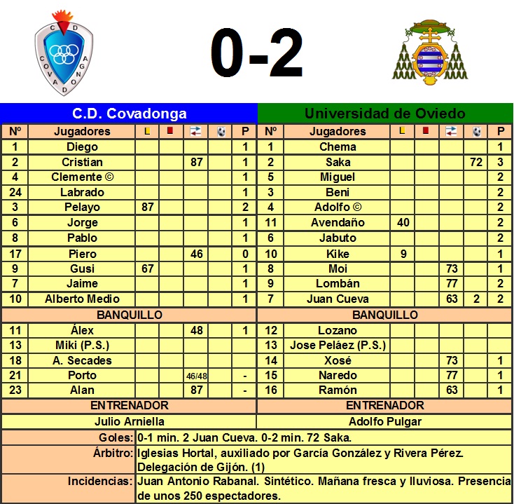 Se le acabó la racha al Covadonga, que había hecho un gran arranque, pero al que le ha frenado un Universidad muy serio en la mañana de hoy. Los locales partieron con el esquema habitual, mientras que Adolfo Pulgar salió con tres centrales y dos carrileros, un sistema que ya utilizó veces anteriores. Se adelantaron muy pronto los estudiantiles, un centro desde la izquierda de Jorge Lombán era rematado en caída por Juan Cueva que batía a Diego Dos Santos como se ve en la imagen. Los dos equipos buscaron un juego elaborado, sacando el balón desde atrás y sin abusar del juego directo. En el 39' un centro de Saka a punto estuvo de mandarlo a la red de su propia portería Clemente, pero acabó en córner. El Covadonga no encontraba la forma de abrir la fortaleza del Universidad, que se mostró muy bien plantado en el terreno de juego y no concedió apenas ocasiones. Al descanso, Julio Arniella buscó un revulsivo, dio entrada a Porto por un apagado Piero en la matinal de hoy. El mediapunta ovetense salía de una lesión en la rodilla y disputaba sus primeros minutos, pero sólo duró minuto y medio en el campo, sin rivales de por medio, resbaló y un mal giro hace presagiar que pueda tener la lesión de moda, rotura del ligamento cruzado. El jugador fue evacuado en camilla y asistido posteriormente por la ambulancia, que tardó 30 minutos en llegar, y está a la espera de las pruebas que diagnostiquen la lesión. El Covadonga intentó el empate, pero sin ocasiones claras, un disparo de Jaime a la media vuelta fue la ocasión más clara de los locales. El Uni pudo ampliar distancias en el 56' con un centro desde la izquierda de Avendaño que remató forzado al segundo palo Lombán enviando alto su disparo. El Covadonga jugaba en campo contrario pero no conseguía pisar área. En el 72' llegó la sentencia, un centro de Ramón desde la izquierda lo cabecea Saka a la red. Con el tiempo cumplido, Avendaño pudo conseguir el 0-3 aprovechando un error de comunicación entre la defensa y el portero local, que sacó bajo palos Alan. Cuarta victoria consecutiva del Uni, que les mantendrá una jornada más en los puestos de play off, mientras que el Cova seguirá en la mitad alta de la clasificación. Fotos: