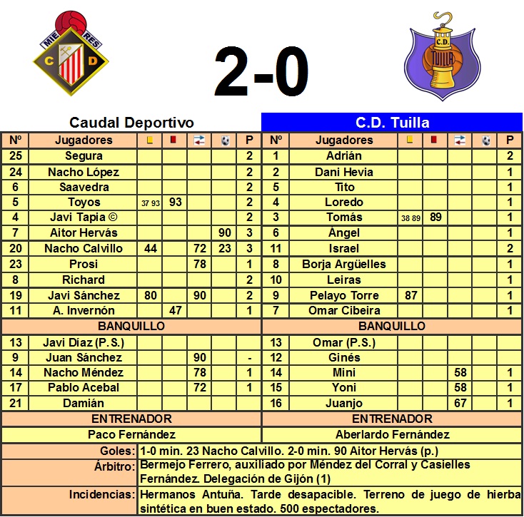 Partido de la 5ª jornada en Tercera, el primer clasificado recibía al segundo después de encajar el jueves la derrota por 5-0 en El Candín. La sed de venganza de los hombres de Paco, se trasladó al terreno de juego con buen juego y ganas por llevarse la victoria. El Caudal salió con tres centrales y dos carrileros como viene siendo habitual esta temporada y le dio buen resultado al equipo blanquinegro. Los mierenses dominaron en la primera parte la posesión y en el min. 23, Nacho Calvillo, que se movió con bastante libertad por las dos bandas, recortaba desde la derecha hacia adentro y batía a Adrián desde fuera del área. El Tuilla no intimidó la meta de Segura en el primer tiempo y los caudalistas sólo tuvieron otra ocasión, fue en el 38', un centro de Aitor Hervás que Prosi recibió en el primer palo y disparó al lateral de la red. Tras una primera parte sin ocasiones, el Tuilla salió más metido en la segunda y a los dos minutos, un córner botado por Israel desde la izquierda, lo cabecean al segundo palo y Armando Invernón bajo palos saca con la mano, penalti y expulsión que no dio lugar a dudas. Borja Argüelles fue el encargado de lanzarlo y su disparo se estrelló en el travesaño. El Caudal no le perdió la cara al partido, manteniendo el esquema y dejando a Javi Sánchez como único hombre de ataque. En el 61', Pelayo Torre finaliza mal una contra después de plantarse sólo ante Segura, perdiendo una clara ocasión para empatar. Dos minutos más tarde, una cesión al meta langreano, Adrián, que fue provocado por la afición mierense durante el partido, se lució haciendo un sombrero a Nacho Calvillo, que seguro que puso por momentos el corazón de Abelardo y Roberto Robles a máximas pulsaciones. El Tuilla no daba la impresión de poder empatar el partido, ante un Caudal que buscaba el disparo lejano aprovechando que Adrián estaba adelantado y en el 79' Javi Sánchez desde 50 m. apunto estuvo de conseguirlo, pero el meta visitante sacó bajo palos. En el último cuarto, el Tuilla adelantó líneas, aunque sin ocasiones claras, salvo una falta que rechazó Segura a disparo de Leiras. En el 89' llegó la jugada del 2-0, un centro desde la izquierda al segundo palo que cabecea Pablo Acebal, da en la mano de Tomás, costándole la segunda amarilla y señalando el colegiado penalti. Aitor Hervás disparó al centro y abajo al interior de la red. En la prolongación, Toyos era expulsado por doble amarilla, al hacer una falta en el centro del campo, quedando con 9 jugadores el Caudal durante apenas 1-2 minutos. Justa victoria del Caudal, que tuvo la fortuna de que Borja Argüelles marrase el penalti, ya que el partido, con el empate y con uno menos los locales, podría haber cambiado. Los mierenses son líderes con 15 putnos de 15 disputados y aventajan en 3 a su inmediato perseguidor, el U.P. Langreo.
