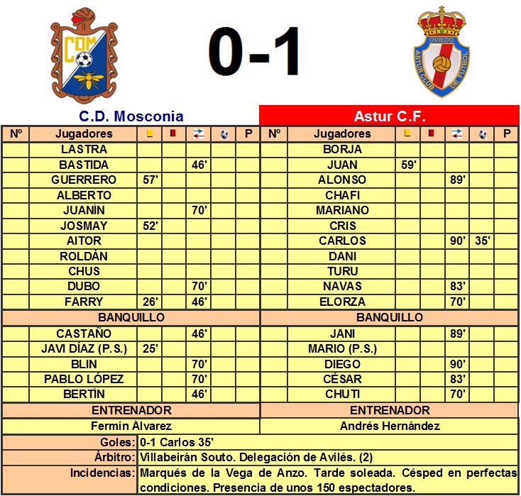 ![]() El Astur rentabilizó el gol del juvenil de segundo año Carlos en un partido, dónde los Moscones merecieron por lo menos marcar un gol, si no lo consiguieron se debió principalmente al desacierto en unas ocasiones de los delanteros de Grado y en otras las buenas paradas ![]() Javier Alonso: La primera parte fue muy entretenida con los dos equipos volcados al ataque lo que provoco que ambos equipos crearan muchas llegadas y ocasiones de gol, el primero en avisar fue el Astur en un remate del peligroso delantero Turu en el minuto 5 despejando de puños Lastra, la replica del Mosconia y primer disparo con peligro lo protagonizó Dubo en el 15 de partido, pero su remate solo ante Lastra se fue desviado. Por último las dos últimas jugadas muy claras con las que pudieron marcar ambos equipos en este primer tiempo, fueron los mismos protagonistas que antes, es decir Turu en el 17 que solo ante ele meta Moscón Lastra, este se lució para despejar a corner, mientras Dubo la tuvo también muy clara en el 19 pero Borja se lució para despejar de puños su disparo. El gol llegaría sin embargo en el 35 en un centro de Juan desde la derecha que aprovechó el juvenil Carlos para batir de tiro raso y muy ajustado al poste derecho de Lastra. La segunda parte el cansancio hizo mella en los dos equipos, prueba de ello es que no crearon tantas ocasiones como en la primera, solo destacar un par de jugadas que pudieron cambiar el resultado, en el 68' un mal despeje de Lastra que la defensa del Mosconia a punto estuvo de marcar Navas, pero no llegó por milímetros a conectar el disparo, un minuto después también la tuvo Navas, esta vez en una gran centro de Carlos desde la izquierda que le dejó en bandeja solo a Navas para marcar, pero como antes le falto un milímetro para conectar su disparo. Sin embargo el Mosconia tuvo en empate en las botas de Castaño en el 90 de partido, pero se entretuvo demasiado en regates y al final le salió muy bien a los pies de Castaño el portero del Astur Borja, ante la desesperación de Castaño y sus compañeros. |