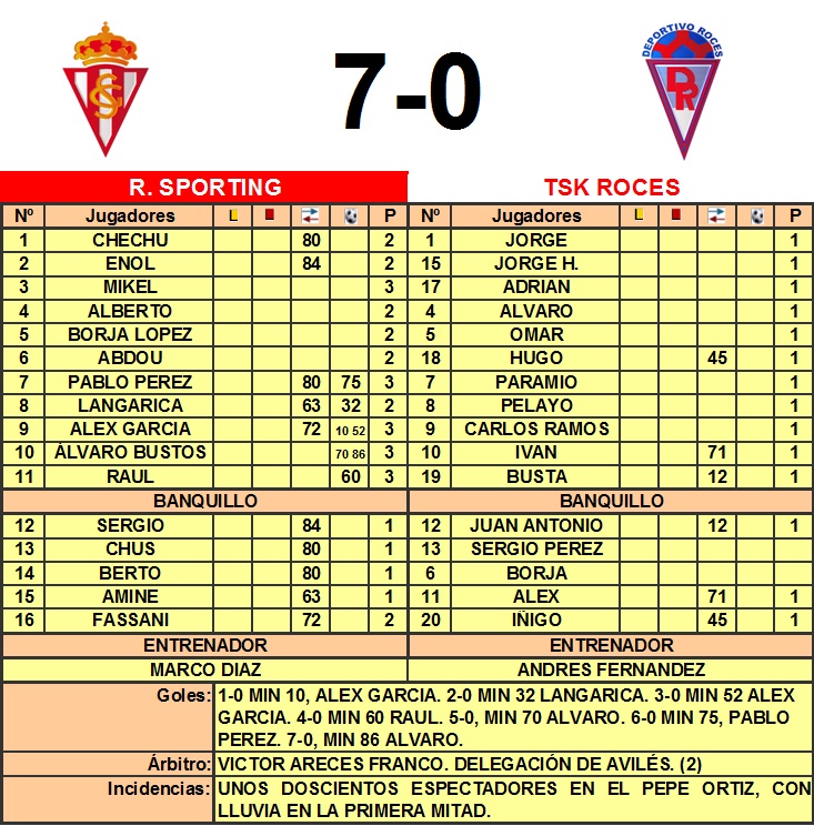 El derby asturiano de D.H. se saldó con goleada sportinguista. 7 tantos anotaron a un Roces que se vio sobrepasado.
